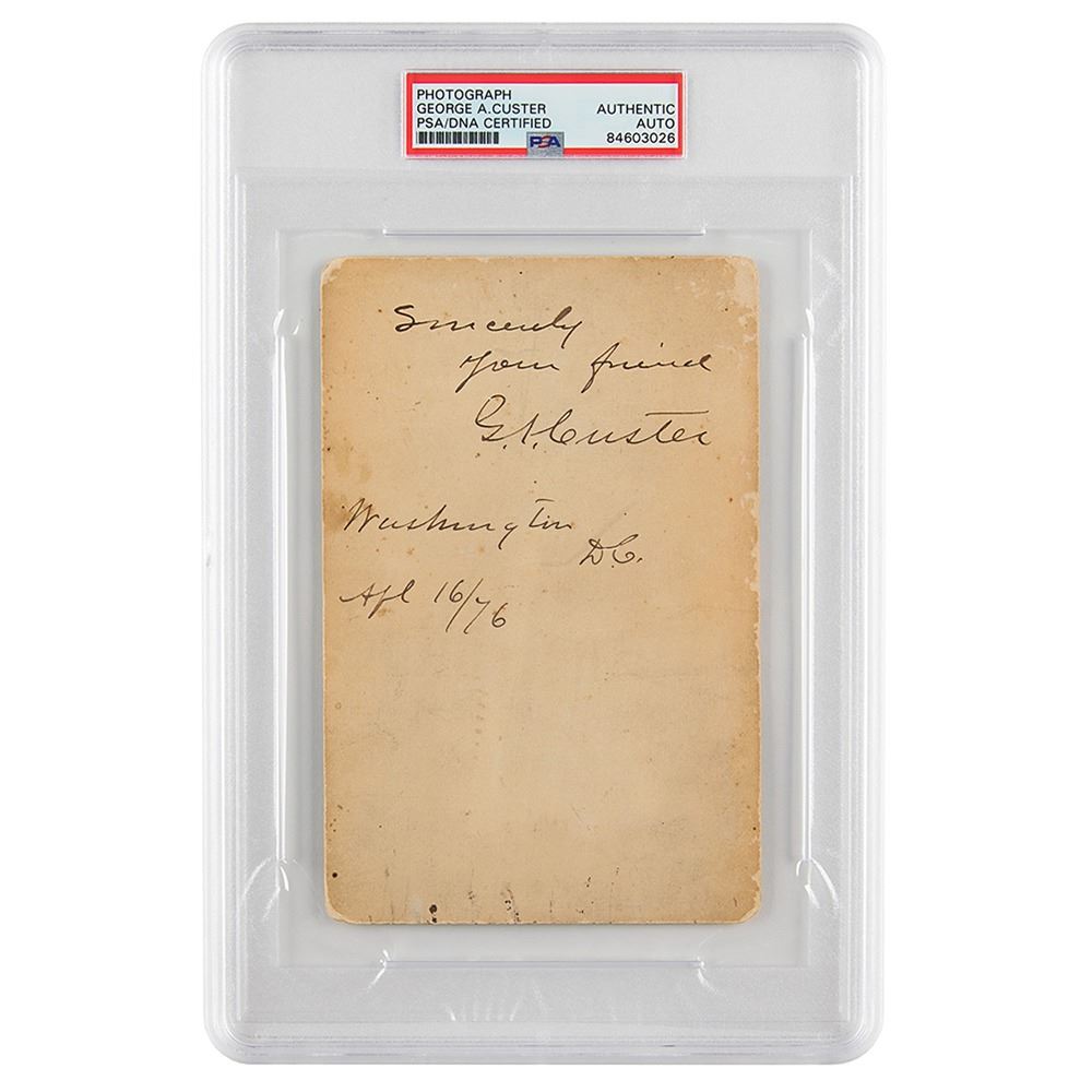 Rare 4.25 x 6.5 bust-length portrait of George A. Custer sporting an impressive mustache, signed and inscribed on the reverse in crisp black ink, "Sincerely, your friend, G. A. Custer, Washington, D. C., Apl 16/76." Published by W. H. Illingworth of St. Paul, Minnesota. In very good to fine condition, with staining, soiling, and small areas of surface loss. Encapsulated in a PSA/DNA authentication holder. Accompanied by a full letter of authenticity from PSA/DNA.
