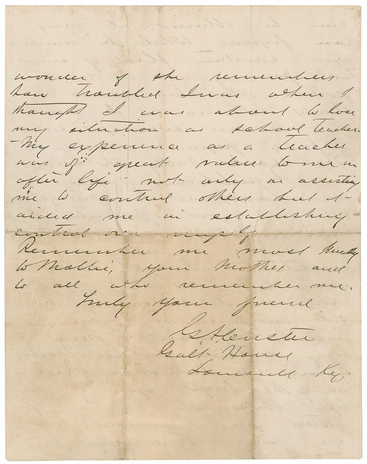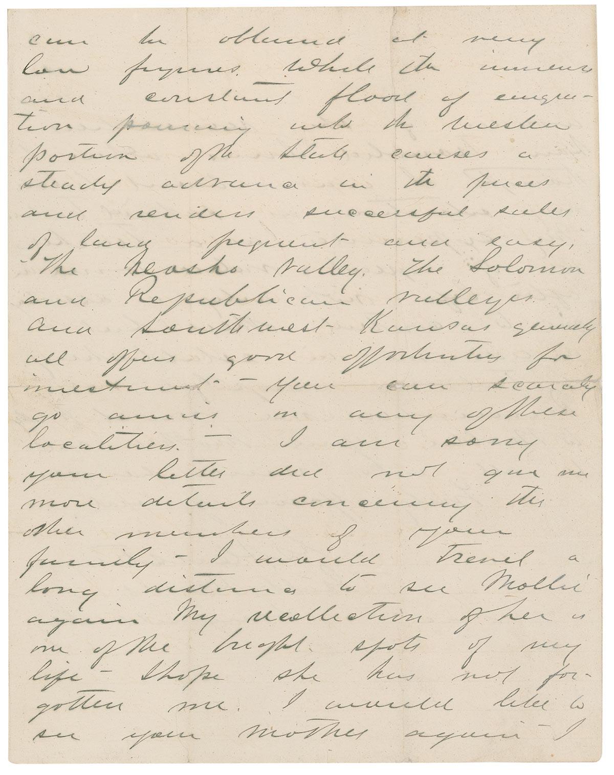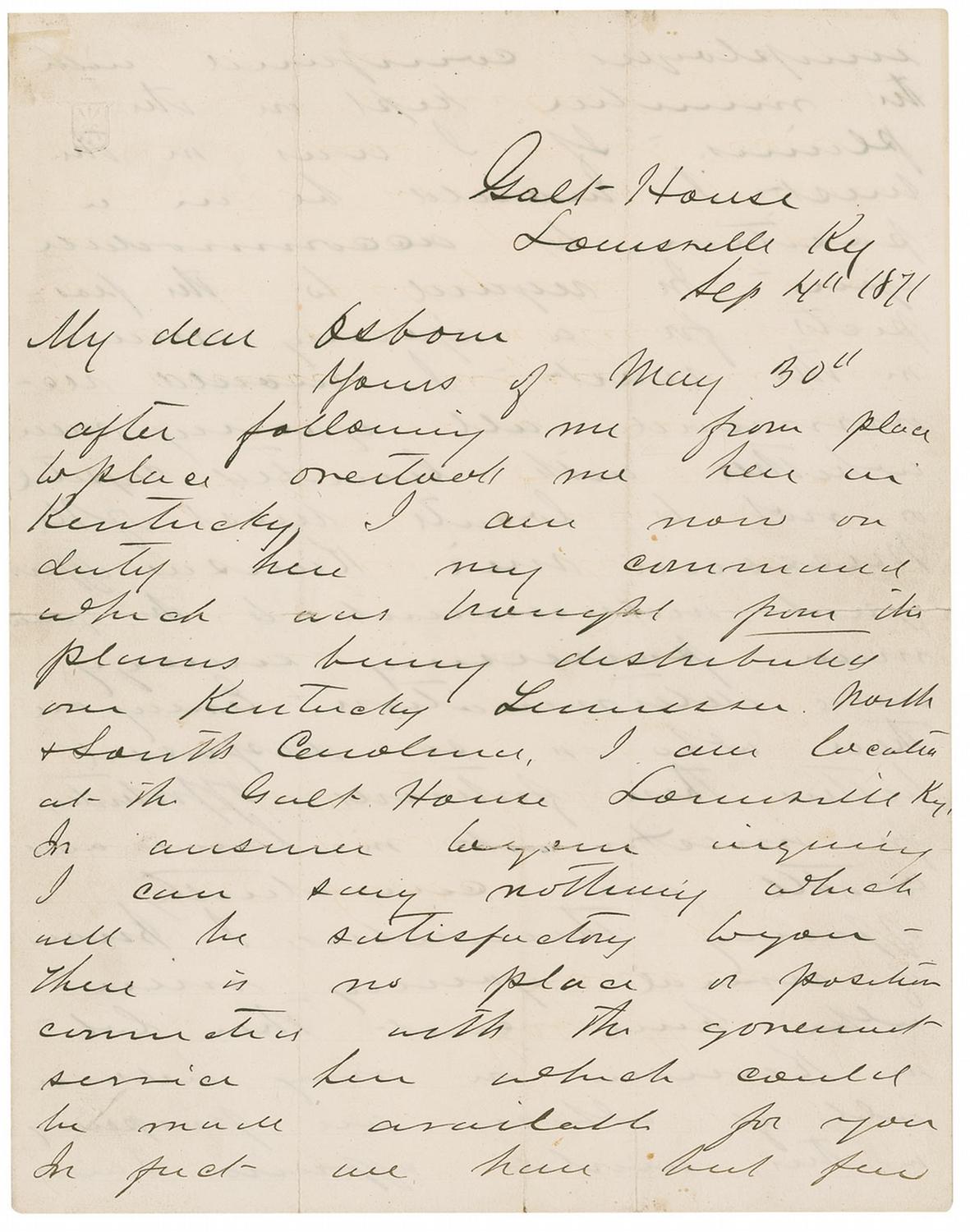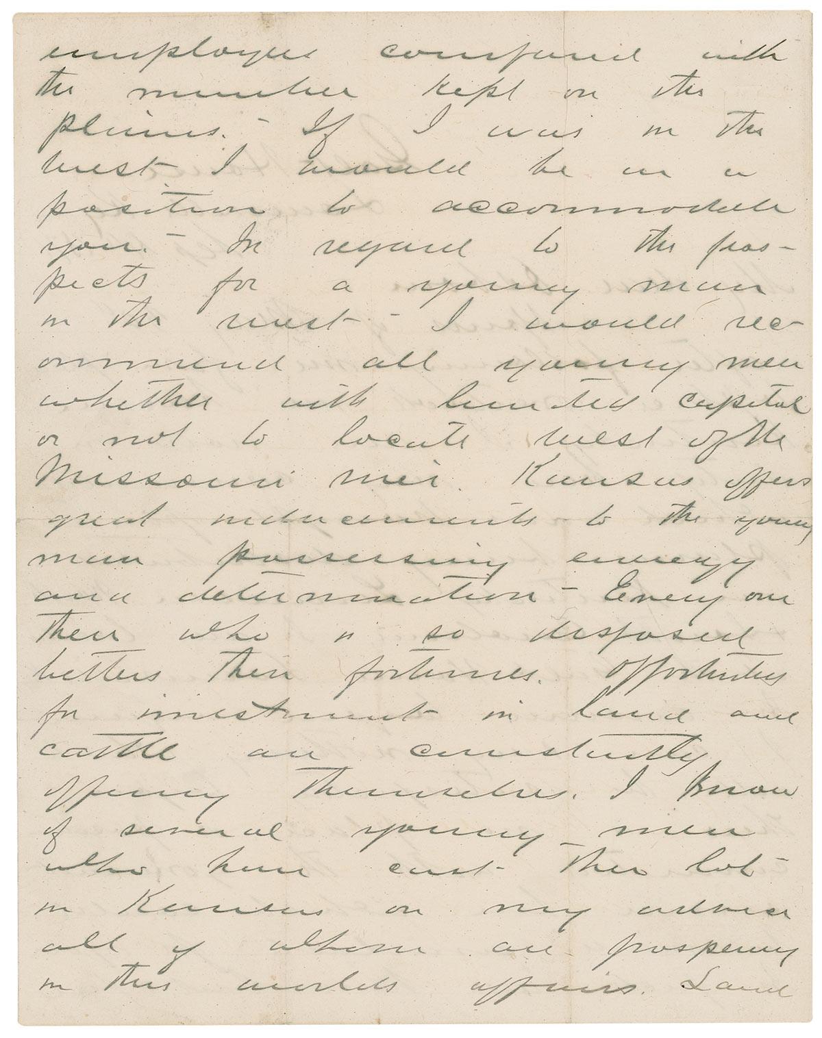 ALS signed “G. A. Custer,” four pages, lightly-lined on two adjoining sheets, 8 x 10, September 4, 1871. Letter to his friend Osborn. In full: “Yours of May 30th after following me from place to place overtook me here in Kentucky. I am now on duty here my command which was brought from the plains being distributed over Kentucky Louisiana North & South Carolina. I am located at the Galt House Louisville Ky. In answer to your inquiry I can say nothing which will be satisfactory to you-there is no place or position connected with the government service here which could be made available for you. In fact we have but few unemployed companies with the members kept on the plains. If I was in the West I would be in a position to accommodate you. In regard to the prospects for a young man in the West-I would recommend all young men whether with limited capital or not to locate West of the Missouri since Kansas offers great inducements to the young man possessing energy and determination. Every one there who is so disposed betters their fortunes. Opportunities for investment in land and cattle are constantly offering themselves. I know of several young men who have cast their lot in Kansas on my advice all of whom are prospering in their worldly affairs. Land can be obtained at very low figures while the issuance and constant flood of emigration pouring into the Western position of the State causes a steady advance in the prices and renders successful sales of land pleasant and easy. The Neosho Valley, the Solomon and Republican Valleys and Southwest Kansas genuinely all offers some opportunities for investment. You can scarcely go amiss in any of these localities. I am sorry your letter did not give me more details concerning the other members of your family. I would travel a long distance to see Mollie again My recollection of her is one of the bright spots of my life. I hope she has not forgotten me. I would like to see your mother again. I wonder if she remembers how troubled I was when I thought I was about to lose my situation as school teacher. My experience as a teacher was of special value to me in after life not only in assisting me to control others but It aided me in establishing control over myself. Remember me most kindly to Mollie, your Mother, and to all who remember me.” In very good condition, with intersecting folds, several through portions of signature, toning and soiling to first and last page, and professional silking to both inside pages resulting in a slightly fuzzy appearance. Letter is housed in a custom-made linen portfolio with a light tan morocco spine.