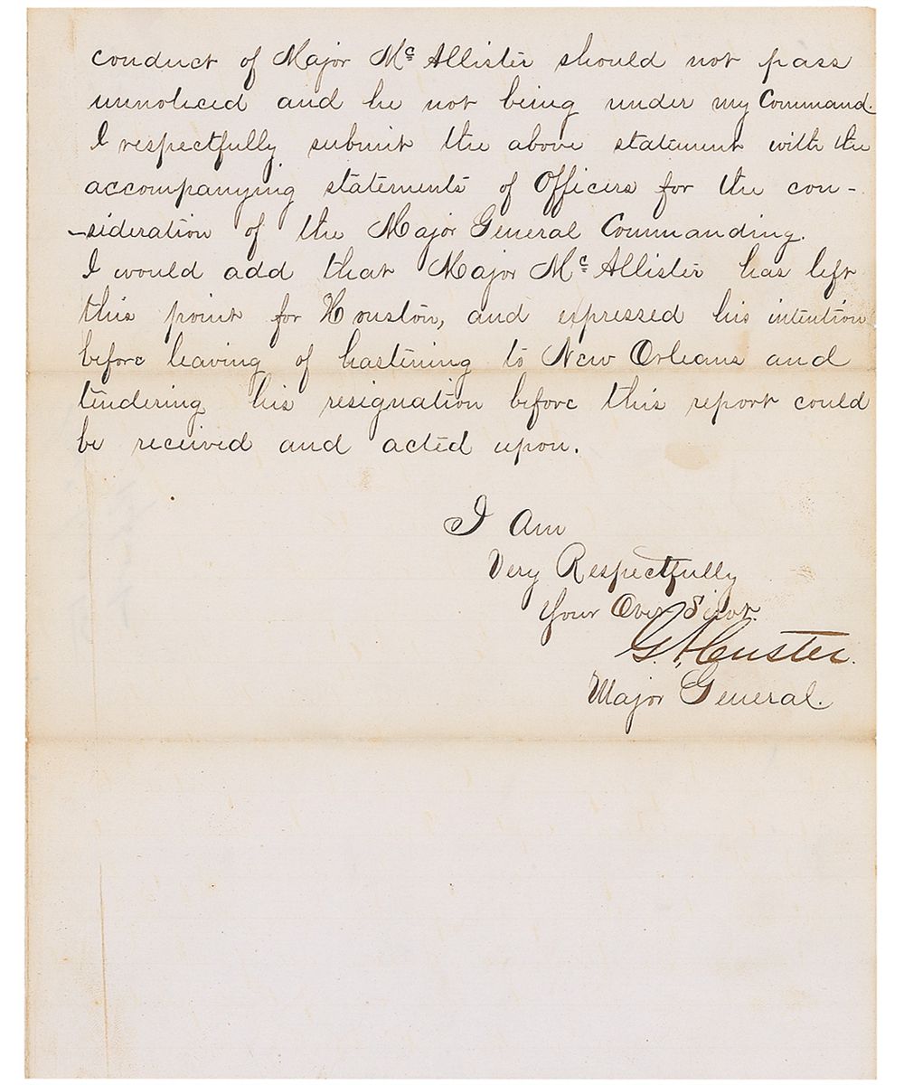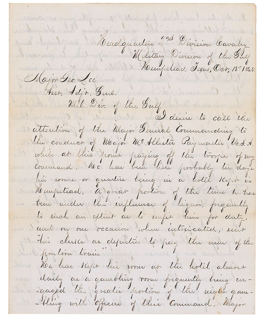 In October of 1865, only six months after the close of the Civil War, Custer led the 2nd Division of Cavalry into Austin, where he became Chief of Cavalry for the Department of Texas. The duration of the march and occupation there was marked with considerable friction and near mutiny from the volunteer cavalry regiments who resented the imposed discipline from this Eastern Theater general for whom they had no respect. In this letter, Custer focuses on a newcomer to his command, Major McAllister, who appears to have joined the insolent troops, encouraged their misbehavior, and left for New Orleans as quickly as he came.