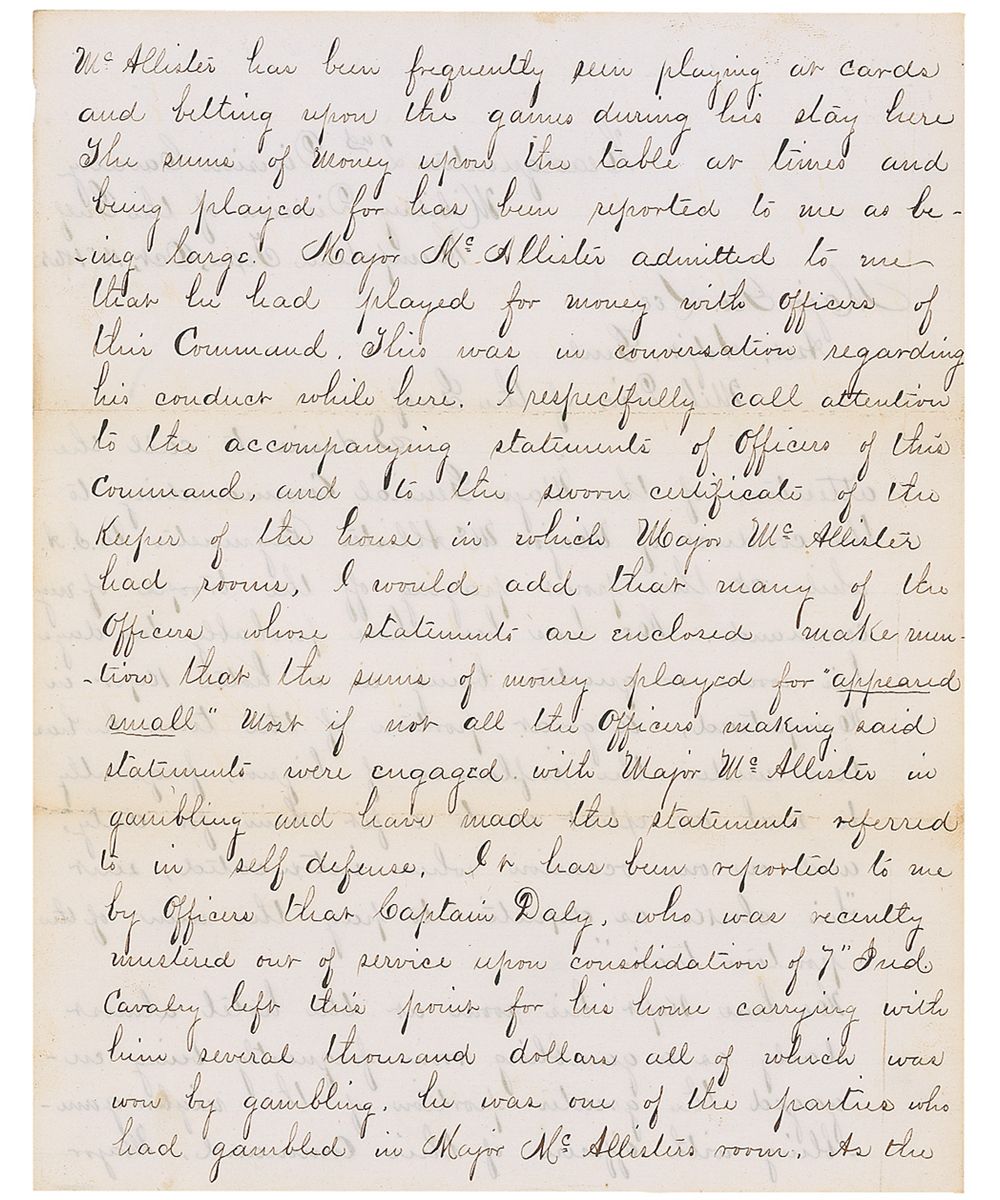LS signed “G. A. Custer,” 7.75 x 9.75, October 15, 1865. Letter to Major George Lee complaining of the conduct of a paymaster under Custer’s command. In part: “I desire to call the attention of the Major General Commanding to the conduct of Major McAllister Paymaster U.S.A. while at this point paying off the troops of my command. He has been here probably ten days…a great portion of the time he has been under the influence of liquor, frequently to such an extent to unfit him for duty, and on one occasion when intoxicated, sent ‘his clerks as deputies to pay the men of the pontoon train.’ He has kept his room at the hotel almost daily as a gambling room frequently being engaged the greater portion of the night gambling with officers of this Command. Major McAllister has been frequently seen playing cards and betting upon the games during his stay. The sum of money upon the table at times and being played for has been reported to me as being large…I respectfully submit the above statement with the accompanying statements of Officers for the consideration of the Major General Commanding. I would add that Major McAllister has left this point for Houston, and expressed his intention before leaving of hastening to New Orleans and tendering his resignation before this report could be received and be acted upon.” Partial separation along hinge, scattered mild toning, and slight show-through from text on reverse, otherwise fine condition.