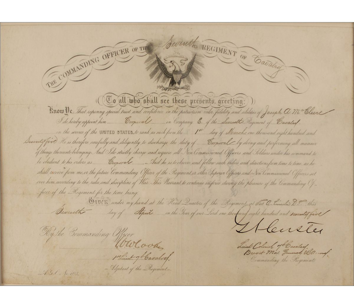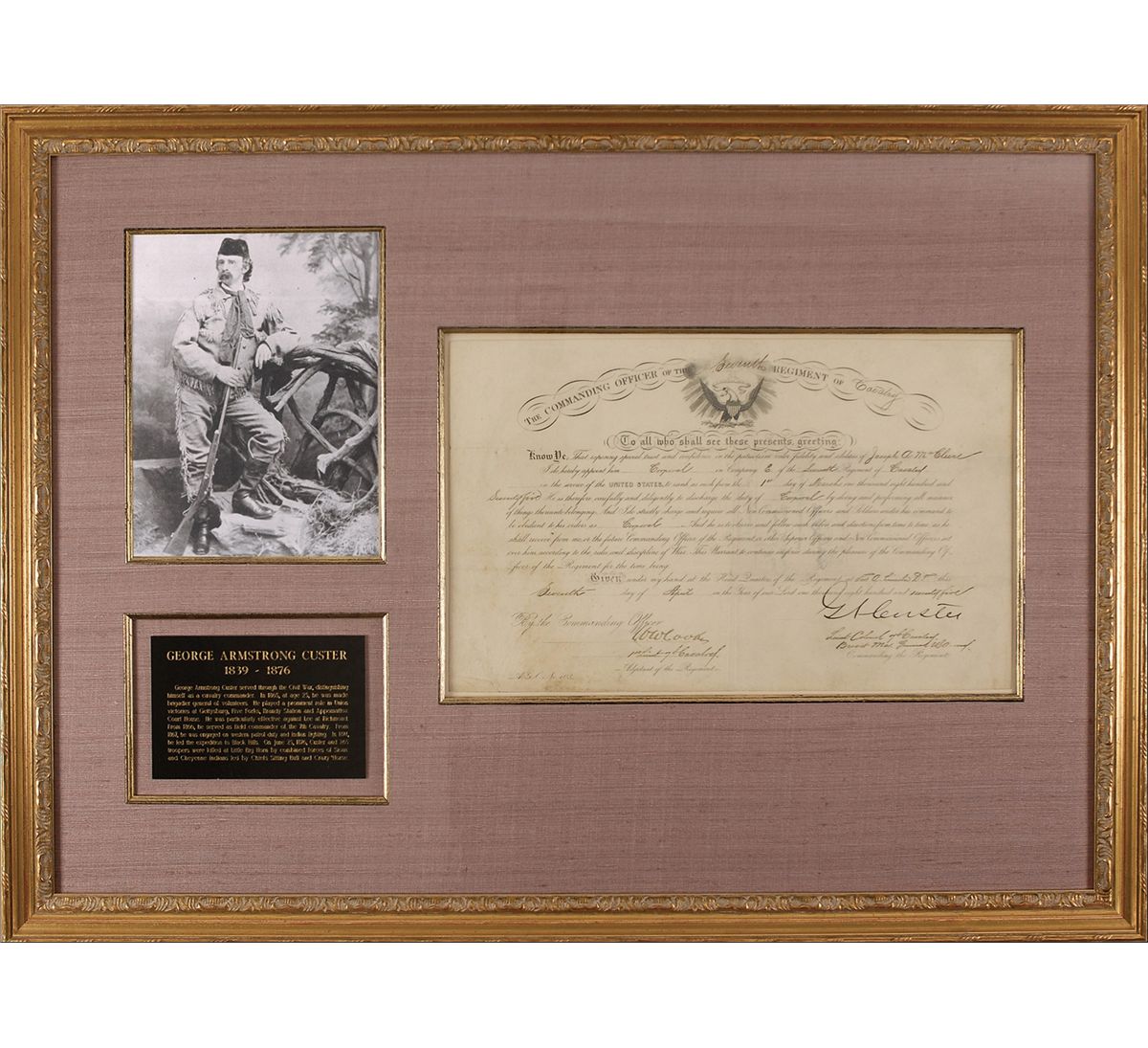 Civil War general and Indian fighter (1839–1876) who distinguished himself as a cavalry commander, earning the rank of brigadier general of volunteers at age 23. Following the Civil War he became field commander of the 7th Cavalry and led troops in a number of engagements during the Indian Wars. Custer, together with all of the men under his immediate command, was killed at the Battle of Little Bighorn on June 25, 1876. Partly-printed DS, signed “G. A. Custer,” one page, 15.5 x 9.75, April 7, 1875. Custer, as Lieutenant Colonel of the Cavalry appoints “Joseph A. McClure…Corporal in Company E of the Seventh Regiment of Cavalry in the service of the United States.” Robustly signed at the bottom by Custer, “G. A. Custer,” and countersigned by commanding officer W. W. Cook. Cloth matted and framed with an image of Custer and a biographical plaque, to an overall size of 32 x 23.25. Intersecting folds, scattered light toning and foxing, and show-through from docketing on reverse, otherwise fine condition.