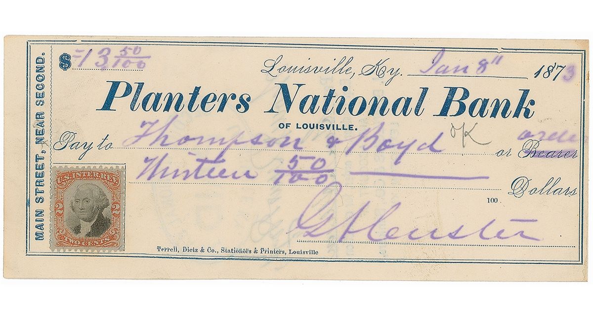 Practically nonexistent Planters National Bank check, 7 x 2.75, filled out and signed by Custer, “G. A. Custer,” payable to Thompson & Boyd for $13.50, January 8, 1873. In fine condition, with a small completely unobtrusive cancellation cut to center, just touching the top of first letter of the signature, some slight blurriness to the otherwise bold handwriting, and minimal show-through from an endorsement on the reverse. The expected 2¢ revenue stamp, picturing Jefferson, is affixed to the lower left. The local newspaper advertisements for the Lexington, Kentucky, firm of Thompson & Boyd lists the company as “Manufacturers of Fine Saddles and Harness, in every style and finish known to the trade. Race and Trotting Equipments a speciality.” Custer’s 7th Cavalry was stationed at Taylor Barracks, Elizabethtown, Kentucky, from October 1871 to March of 1873. At the time of writing this check, Custer and his wife were making plans to attend the March 4th inauguration of U. S. Grant. Instead, the 7th Cavalry was ordered to the Dakota Territory to help protect a party of surveyors from the Sioux as they were laying out the route for the proposed Northern Pacific Railroad. This check is just the second one we have encountered in over 30 years.