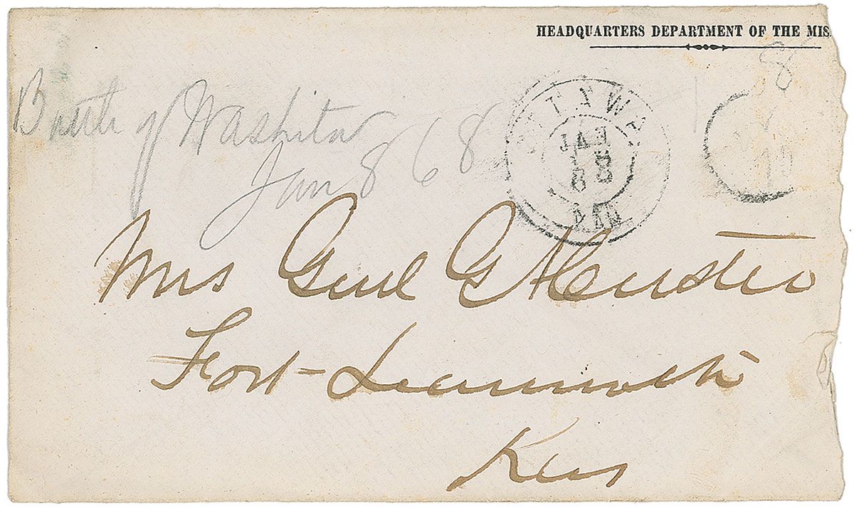 Headquarters, Department of the Missouri mailing envelope, 5.5 x 3.25, addressed in Custer’s hand to his wife (and incorporating his signature), “Mrs. General G. A. Custer, Fort Leavenworth, Kans.” Envelope also bears a January 18, 1869, Ottawa, Kansas, postmark, and is docketed in pencil in Mrs. Custer’s hand, “Battle of Washita Jan 8 68 [sic].” Expected creases and torn right edge, otherwise fine condition.