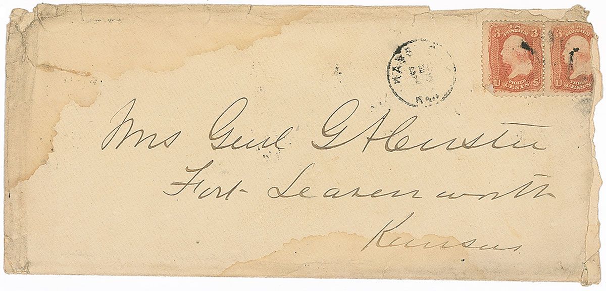 Hand-addressed envelope, 8.25 x 3.75, addressed by Custer to, “Mrs. Genl. G. A. Custer, Fort Leavenworth, Kansas,” bearing two three-cent George Washington postage stamps and a Hays City, Kansas, postal cancellation. In very good condition, with dampstaining to two edges, lightly affecting “Kansas,” edgewear and creases, and a separated right edge.