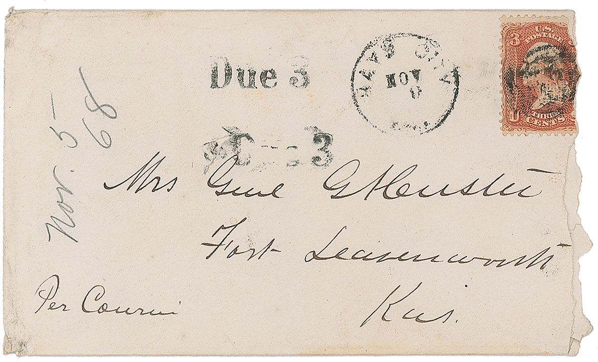 Mailing envelope, 5 x 3, addressed in Custer’s hand to “Mrs. Genl. G. A. Custer, Fort Leavenworth, Kas., Per Courier.” Envelope bears a three-cent George Washington postage stamp, as well as a December 11, Hays City, postmark, and two “Postage Due” stamps. Envelope is also docketed by Mrs. Custer in pencil, “Nov. 5, 68.” In fine condition, with separated right edge and some light creasing.