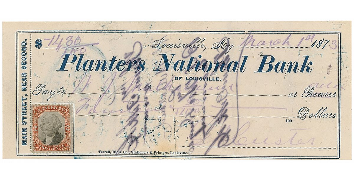 Exceedingly scarce Planters National Bank of Louisville check, 7 x 2.75, filled out and signed by Custer, “G. A. Custer,” payable to W. J. Mulholland or order for $14.30, March 1, 1873. A two-cent revenue stamp is affixed to the lower left corner. In very good condition, with several vertical folds, one through a single letter of signature; cancellation cut to body; moderate show-through from bold endorsement on the reverse over the “G. A.,” other handwritten portions, and slightly touching the beginning of last name; and Custer’s writing a shade or two light, but still legible. In October of 1871, General George Armstrong Custer and his 7th Cavalry were sent to the Taylor Barracks in Elizabethtown, Kentucky, to monitor activities of the Ku Klux Klan, fight bushwhackers, and shut down illegal distilleries. Six days after signing this check, Custer and his men were ordered to the Dakota Territory to help protect a party of surveyors from the Sioux as they were laying out the route for the proposed Northern Pacific Railroad. After the troops withdrew from Elizabethtown, the post was terminated in compliance with Special Orders No. 13, Department of the South. One of just a scant handful of Custer checks we have offered in over 30 years.