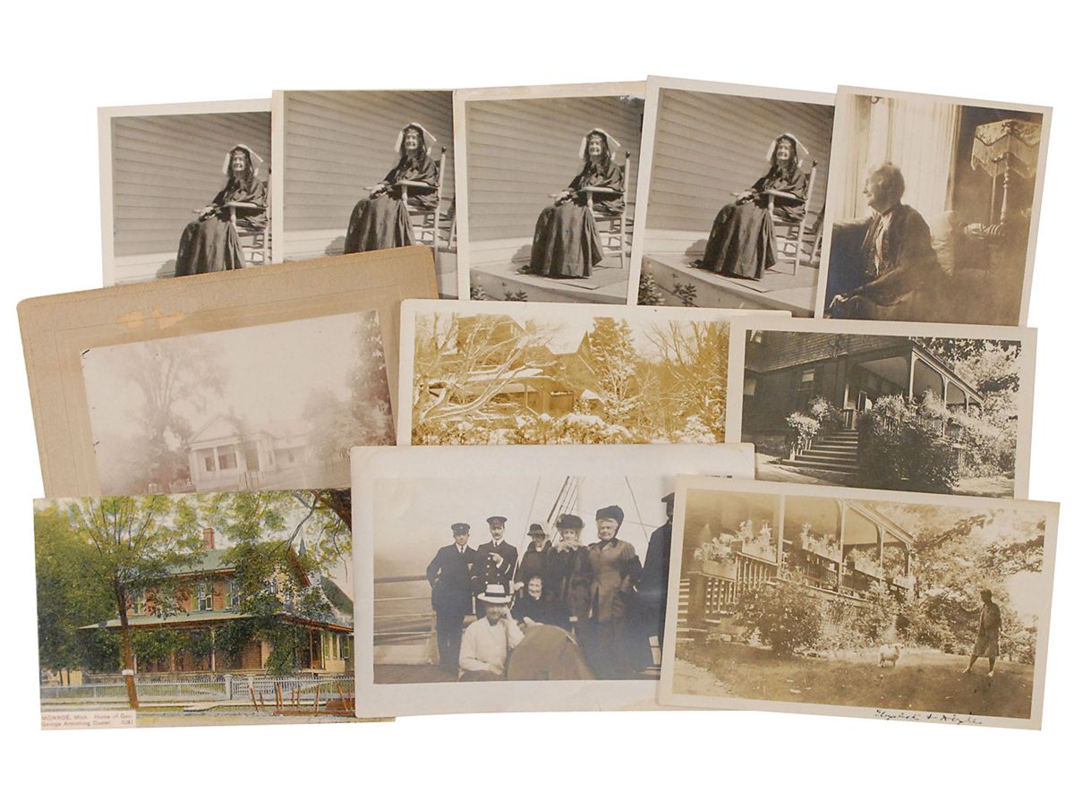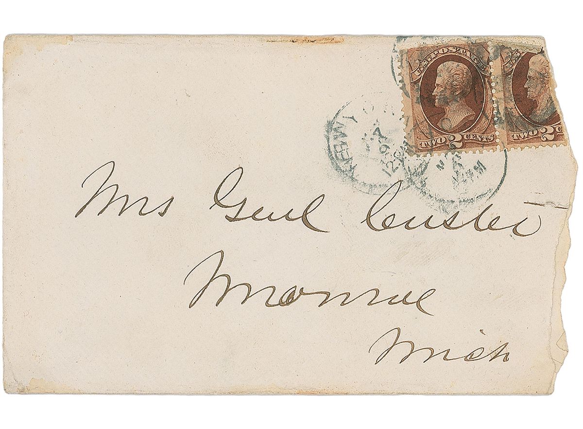Hand-addressed mailing envelope, 5.25 x 3.25, addressed by Custer to his wife, “Mrs. Genl Custer, Monroe, Mich,” bearing a New York, May 9, 1871, postal cancellation. Scattered creases and a rough right edge from opening, otherwise fine condition. Accompanied by 10 vintage photographs, seven picturing Mrs. Custer and their home in Monroe, along with a color German postcard photo of the residence.