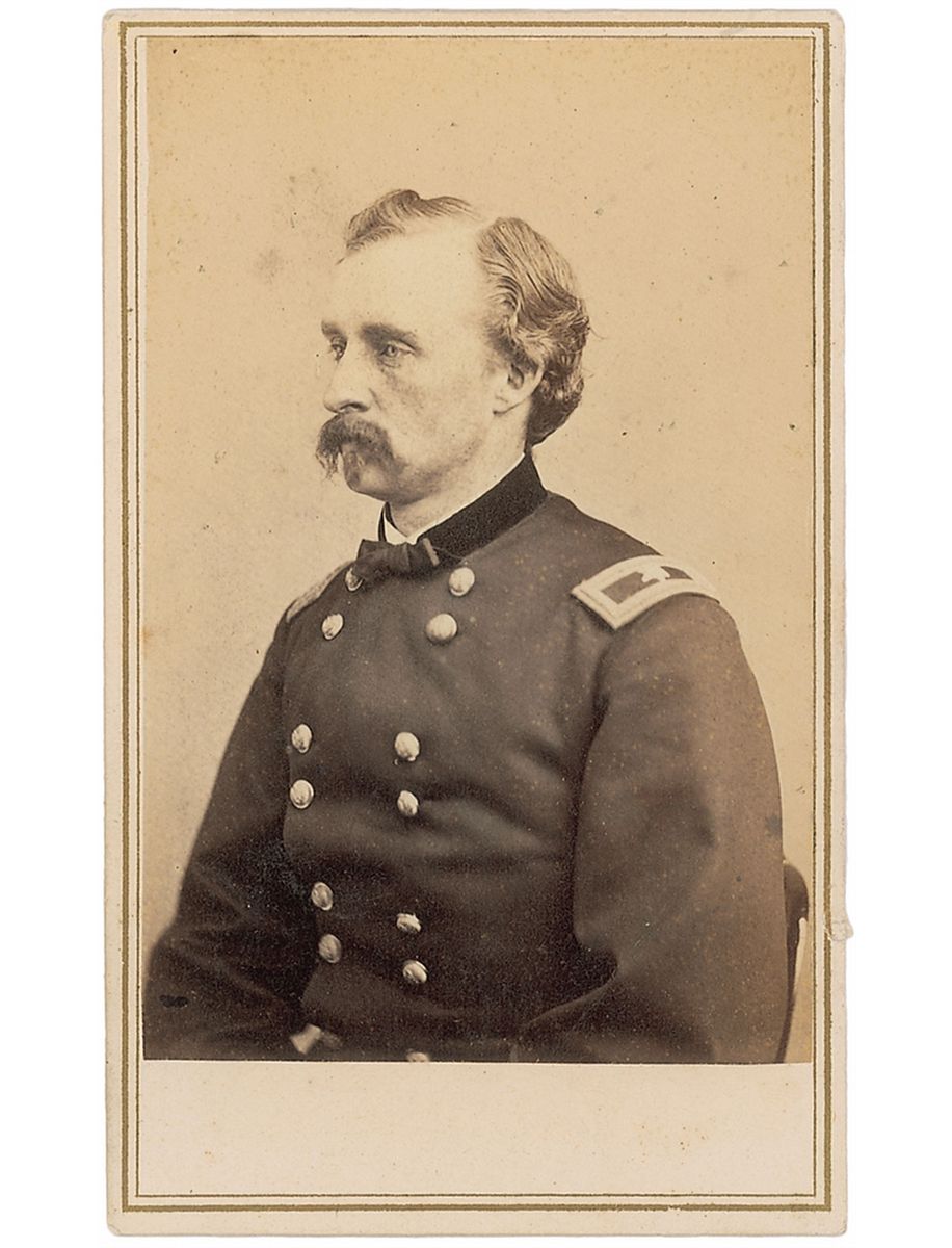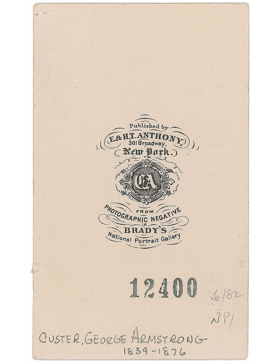 A highly desirable circa 1860s unsigned carte-de-visite portrait of Custer, 2.25 x 4, published by E. & H. T. Anthony of New York from the original Mathew Brady negative. In fine condition. Light edge wear, a small portion of paper loss at a spot on the front right edge, and pencil notations and an ink stamp on the reverse, otherwise fine condition. A sharp, clean example of the heroic cavalry leader.