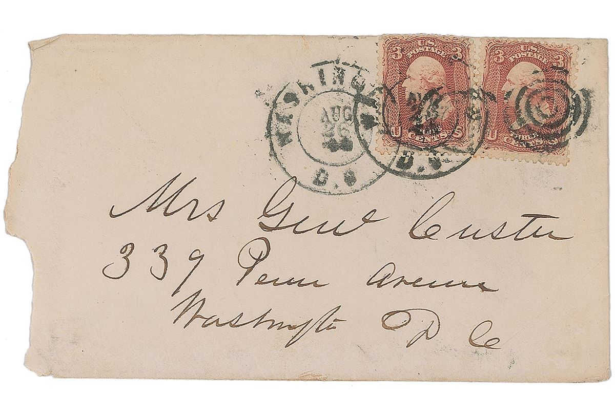 Hand-addressed mailing envelope, 5.25 x 3, addressed by Custer to his wife, “Mrs. Genl. Custer, 339 Penn Avenue, Washington, D. C.,” bearing two affixed three-cent postage stamps and postmarked Washington, August 26. In fine condition, with a torn left edge from opening.