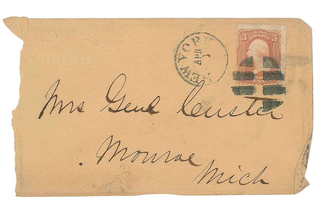 Hand-addressed mailing envelope, 5.25 x 3, addressed by Custer to his wife, “Mrs. Genl. Custer, Monroe, Mich,” bearing an affixed three-cent postage stamp and postmarked New York, April. In very good condition, with a torn left edge from opening, light creasing and soiling, and slight spreading to the writing (the postmark stamps trivially affecting two letters).