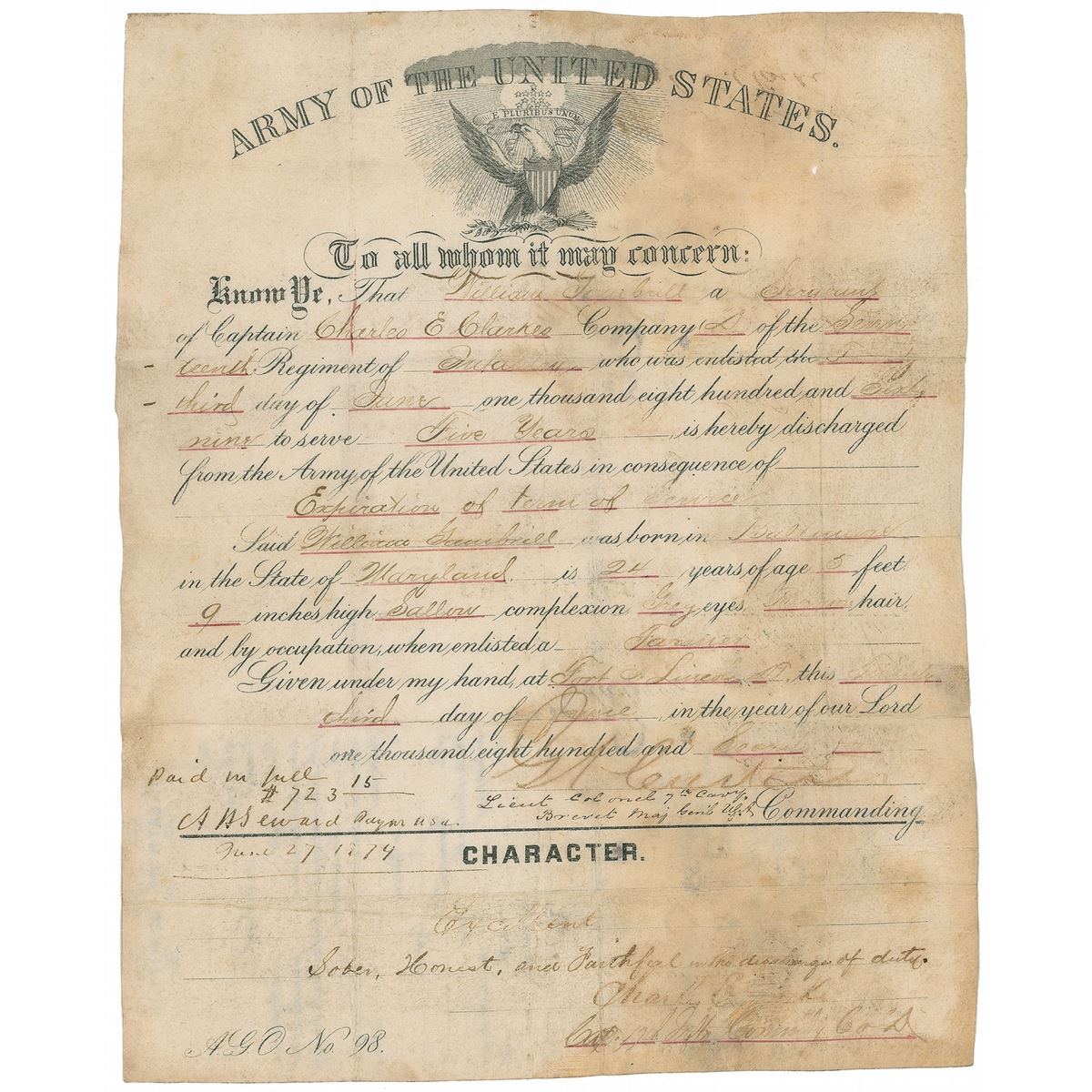Partly-printed DS, signed “G. A. Custer,” one page, 7.5 x 9.25, June 23, 1874. As commander of the 7th Cavalry at Fort Abraham Lincoln in the Dakota Territory, Custer discharges one of his soldiers. In part: “Know Ye, That William Gambrill a Sergeant of Captain Charles E. Clarkes Company D of the Seventeenth Regiment of Infantry who was enlisted…to serve Five Years is hereby discharged from the Army of the United States in consequence of Expiration of term of Service. Said William Gambrill was born in Baltimore in the State of Maryland, is 24 years of age 5 feet 9 inches high sallow complexion Grey eyes Brown hair, and by occupation when enlisted a Farmer.” Signed at the conclusion by Custer and countersigned by Paymaster Augustus Henry Seward to confirm payment of his salary in full; also signed below by Captain Charles E. Clarke as testimony to Gambrill’s good character, specifying that he was “Sober, Honest, and Faithful in the discharge of duty.” Heavy intersecting folds, overall soiling and dampstaining somewhat affecting legibility, and overall creasing, otherwise very good condition.