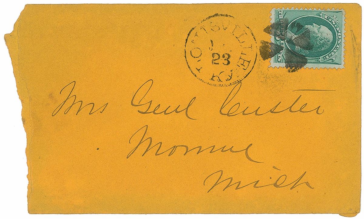 Hand-addressed mailing envelope, 5 x 3, addressed by Custer to his wife, “Mrs Genl Custer, Monroe, Mich,” bearing an affixed three-cent postage stamp and postmarked at Louisville, Kentucky. Light soiling and a torn left edge from opening, otherwise fine condition.