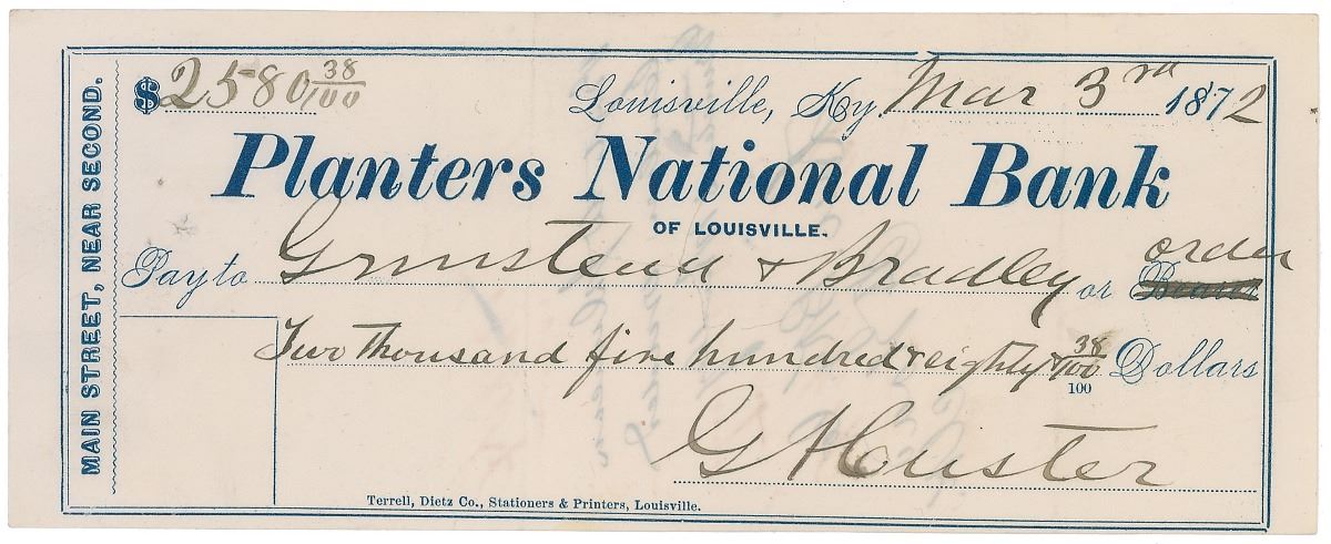 After five years of active duty fighting the Cheyenne, Custer’s famed US 7th Cavalry was transferred to Elizabethtown, Kentucky in October of 1871. Their orders were to control the Ku Klux Klan and to break up illicit distilleries, but with the small town’s lack of any real conflict, the 7th settled into a well-deserved break from action. While there, Custer built up a stable of fine Kentucky thoroughbred horses, along with over eighty well-bred hunting dogs. This check, payable to the Lexington banking firm Grinstead & Bradley, was most likely for the purchase of one such horse, as there are records of Custer buying a horse for $2500 in October of 1872. An incredibly scarce check signed during a brief period of respite before heading back into Plains Indians territory, where he would meet his fate just four years later.