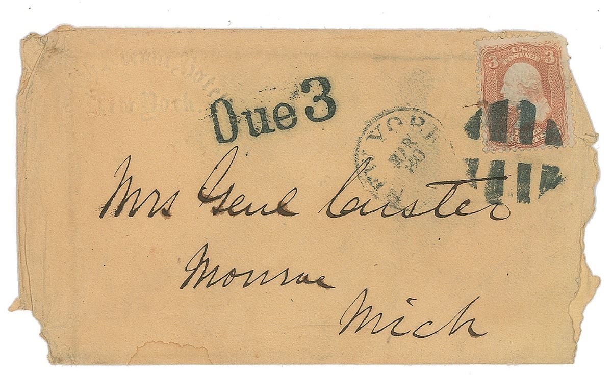 Hand-addressed mailing envelope from New York’s Fifth Avenue Hotel, 5.25 x 3, addressed by Custer to his wife, “Mrs Genl Custer, Monroe, Mich,” bearing an affixed three-cent postage stamp and postmarked March 30, no year. In very good to fine condition, with expected areas of paper loss from handling and opening.