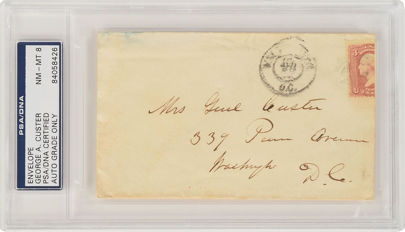 Hand-addressed mailing envelope, 5 x 3, addressed by Custer to "Mrs. Gen'l Custer, 339 Penn. Avenue, Washington, D. C." Encapsulated in a plastic PSA/DNA authentication and grading holder, evaluating the autograph as "NM-MT 8." In fine condition, with light soiling and a trimmed right edge.