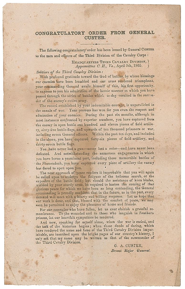 Broadside circular of the historic "Congratulatory Order from General Custer," one page, 6 x 9.5, dated at the Third Cavalry's headquarters at Appomattox Court House on April 9, 1865, the day of General Robert E. Lee's surrender of the Confederate forces. In part: "With profound gratitude toward the God of battles, by whose blessings our enemies have been humbled and our arms rendered triumphant, your commanding General avails himself of this, his first opportunity, to express to you his admiration of the heroic manner in which you have passed through the series of battles which to-day resulted in the surrender of the enemy's entire army. The record established by your indomitable courage, is unparalleled in the annals of war. Your prowess has won for you even the respect and admiration of your enemies. During the past six months, although in most instances confronted by superior numbers, you have captured from the enemy in open battle one hundred and eleven pieces of field artillery, sixty-five battle flags, and upwards of ten thousand prisoners of war, including seven General officers…You have never lost a gun—never lost a color—and have never been defeated. And notwithstanding the numerous engagements in which you have borne a prominent part, including those memorable battles of the Shenandoah, you have captured every piece of artillery the enemy has dared to open upon you…For our comrades who have fallen, let us ever cherish a grateful remembrance. To the wounded and to those who languish in Southern prisons, let our heartfelt sympathies be tendered. And now, speaking for myself alone, when the war is ended, and the task of the historian begins; when those deeds of daring, which have rendered the name and fame of the Third Cavalry Division imperishable, are inscribed upon the bright pages of our country's history, I only ask that my name may be written as that of the commander of the Third Cavalry Division. G. A. Custer, Brevet Major General." In very good condition, with foxing, staining, and intersecting folds. It is believed that this handbill was privately printed in the weeks following the surrender by a Southerner who aimed to sell souvenirs to the occupying Union troops; Custer was not awarded the rank of Brevet Major General until April 15th, six days after he originally issued this congratulatory order.