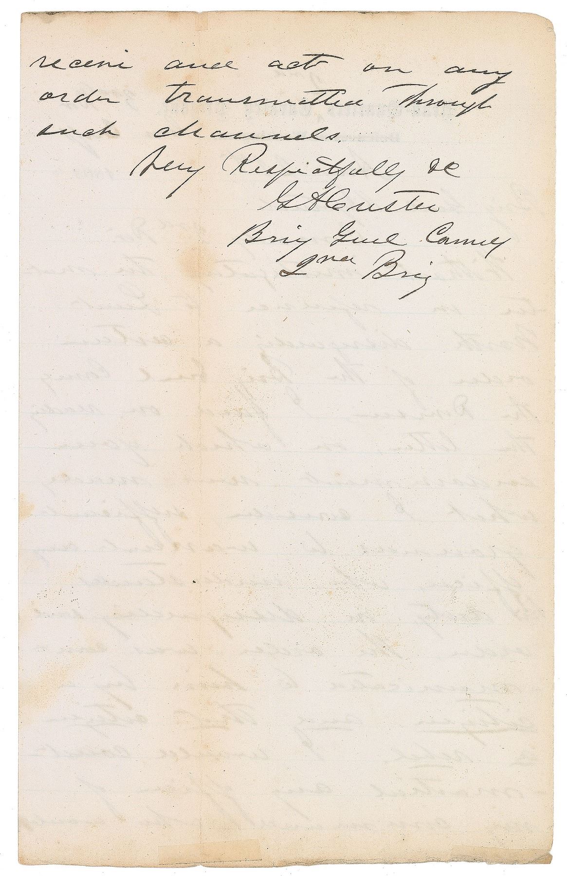 Tremendous Civil War-dated ALS signed "G. A. Custer," one page both sides, 5 x 8.25, Head-Quarters Cavalry Brigade letterhead, August 21, 1863. Letter to General H. J. Kilpatrick, in full: "Commdg 3rd Div. without investigating the matter in reference to Lieut. North disregarding a certain order of the Brig. Genl. com'g the Division, I find on reading the letter, on which your endorsement was made, what I consider, sufficient grounds to warrant any officer, who understands his duty, in disregarding such order, the order was communicated to him by a citizen and that citizen a rebel. I would court-martial any officer of my command who would receive and act on any order transmitted through such channels." Custer modifies the letterhead to read, "Head-Quarters 2nd Cavalry Brigade, 3rd Div., Cav Corp." In very good to fine condition, with light toning along edges and one of the vertical folds.