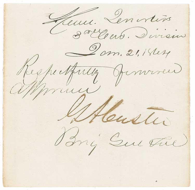 A Civil War general and Indian fighter, Michigan-born George Armstrong Custer (1839–1876) distinguished himself as a cavalry commander, earning the rank of brigadier general of volunteers at age 23. Following the Civil War he became field commander of the 7th Cavalry and led troops in a number of engagements during the Indian Wars. Custer, together with all of the men under his immediate command, was killed at the Battle of Little Bighorn on June 25, 1876. Bold war-dated ink endorsement signature, “G. A. Custer,” on a 3.25 x 3.25 off-white slip, clipped from a larger document, with an endorsement in another hand, “Head Quarters, 3rd Cav. Division, Jan. 21, 1864, Respectfully…approved…Brig. Gen.” Light toning along edge extremes, and a few subtle brushes and blots to signature, otherwise fine condition. Pre-certified John Reznikoff/PSA/DNA and RRAuction COA.