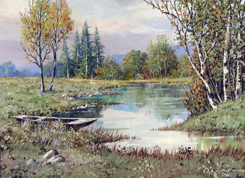 Canadian [b. 1933] AUTUMN LANDSCAPE WITH STREAM AND DISTANT MOUNTAINS oil on canvas 20 x 27 in. (50.8 x 68.6 cm) signed