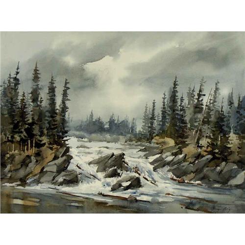 [Canadian ASA b. 1933] UNTITLED (RIVER RAPIDS UNDER GREY SKY) Watercolour on paper 17.25 x 23.25 in. Signed.