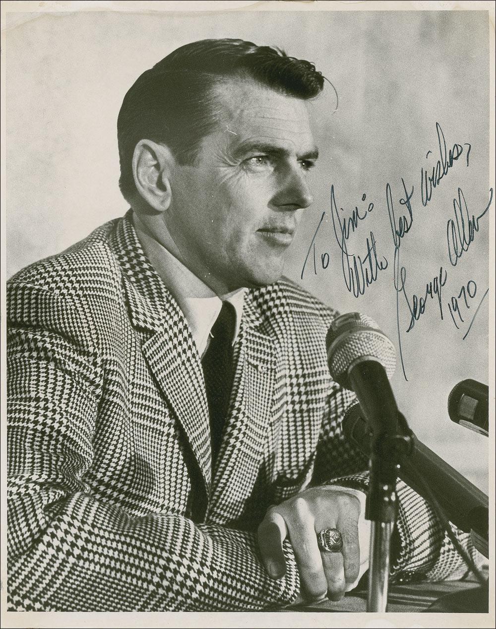 Football Hall of Famer (1918–1990). Vintage glossy 8 x 10 photo of Allen at a microphone, signed and inscribed in black felt tip “To Jim: With best wishes, George Allen 1970.” Date-stamped on the reverse January 11, 1966. In very good condition, with scattered creasing, a few dings, some curling, and staining at the top and bottom borders.