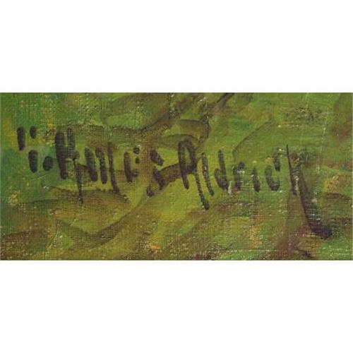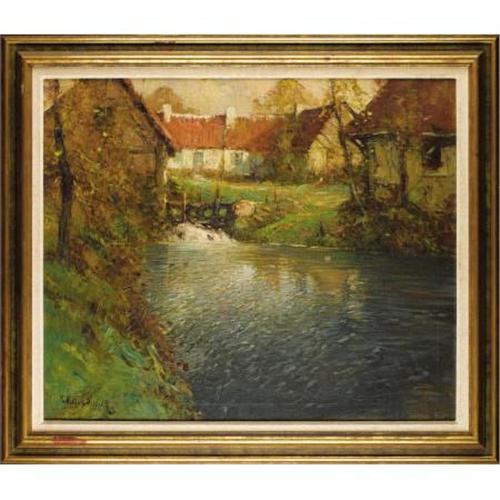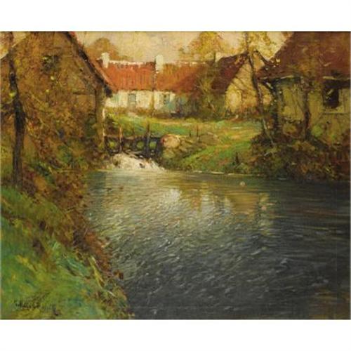 <B>GEORGE AMES ALDRICH (American, 1872-1941)</B></I><BR><I>Cottages Along a River in Normandy</B></I><BR>Oil on canvas<BR>25 x 30 inches (63.5 x 76.2 cm)<BR>Signed lower left: <I>G. Ames Aldrich</B></I> <B>Condition Report:</B> Normal wear commensurate with age, stretched bar marks and craquelure<BR><BR><b>Shipping:</b> Requires 3rd Party Shipping (<a target="_blank" href="http://www.heritageauctions.com/common/shipping.php">view shipping information</a>)