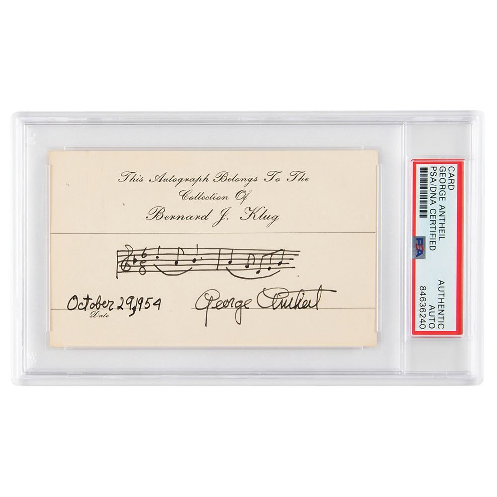 American avant-garde composer, pianist, author, and inventor (1900-1959) who co-patented a & #39;Secret Communications System& #39; with actress Hedy Lamarr in 1941. AMQS on an off-white 5 x 3 card imprinted "Collection of Bernard J. Klug." Antheil pens two bars from one of his works, signing below in bold ink, "October w9, 1954, George Antheil." In fine condition. Encapsulated in a PSA/DNA authentication holder.