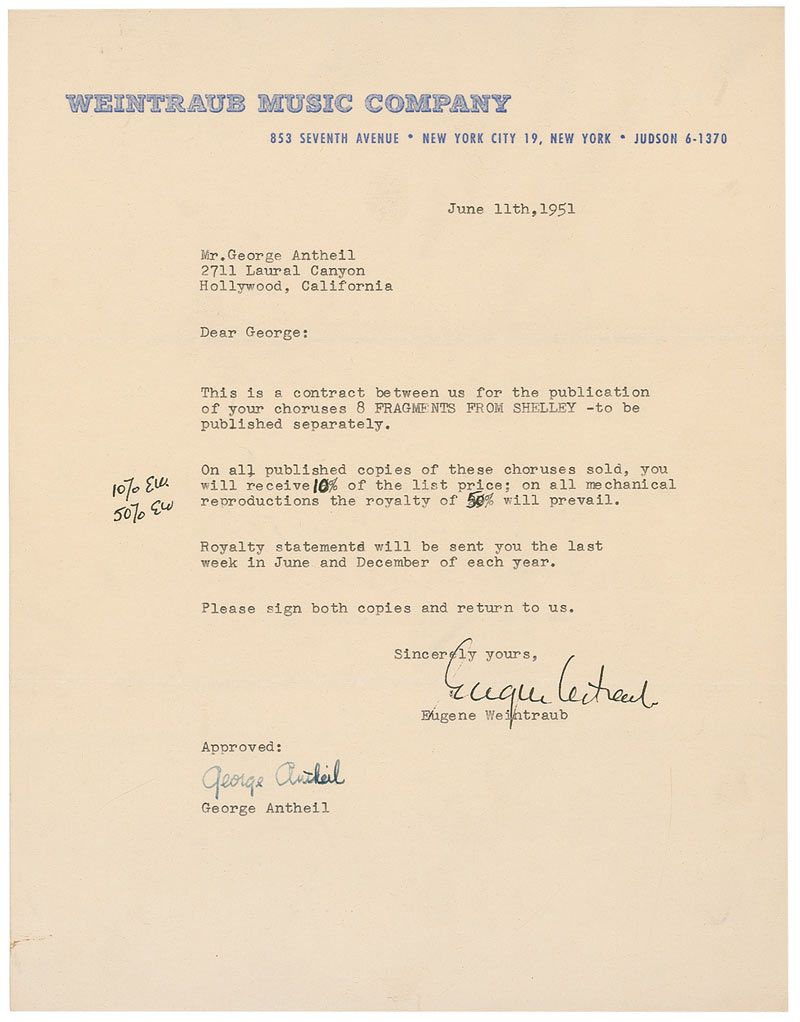 Composer and author (1900–1959). DS, one page, 8.5 x 11, June 11, 1951. Antheil acknowledges an agreement between himself and Weintraub Music “for the publication of your choruses 8 Fragments from Shelley…On all published copies of these choruses sold, you will receive 10% of the list price; on all mechanical reproductions the royalty of 50% will prevail.” In fine condition, with a few wrinkles and a uniform shade of mild toning.