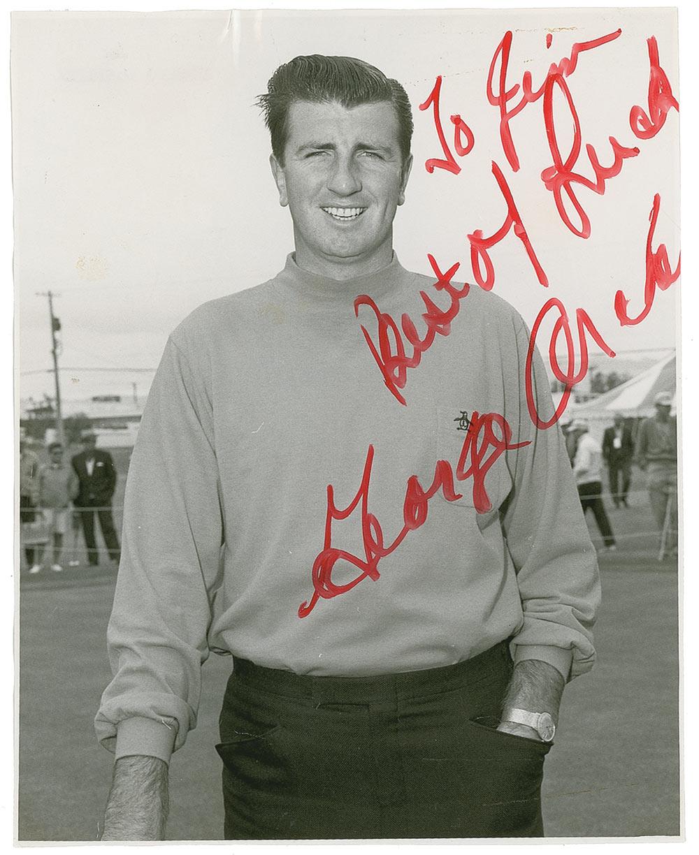 Golfer (1939–2005) who won twelve PGA tour events. Six months after his death his widow revealed that he suffered from a learning impairment that left him illiterate. Glossy 7.75 x 9.75 photo of Archer posing for a photographer, signed and inscribed in red felt tip “To Jim, Best of Luck, George Archer.” A photographer’s credit stamp has been placed on the reverse. Scattered creasing and wrinkling, otherwise fine condition.