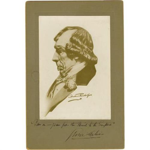 <B>George Arliss Signed Disraeli Portrait.</B></I> A 5.75" x 8.5" print of a sketch portrait of Benjamin Disraeli, inscribed and signed on the 8" x 12" matting by Arliss in black ink. The actor won an Academy Award for his portrayal of the British Prime Minister in <I>Disraeli</B></I> (1929). In overall Fine to Very Fine condition with some edge wear and a small water stain near the left edge. <I>From the collection of John Strangi.</B></I><BR><BR><b>Shipping:</b> Flat Material, Small (<a target="_blank" href="http://www.heritageauctions.com/common/shipping.php">view shipping information</a>)