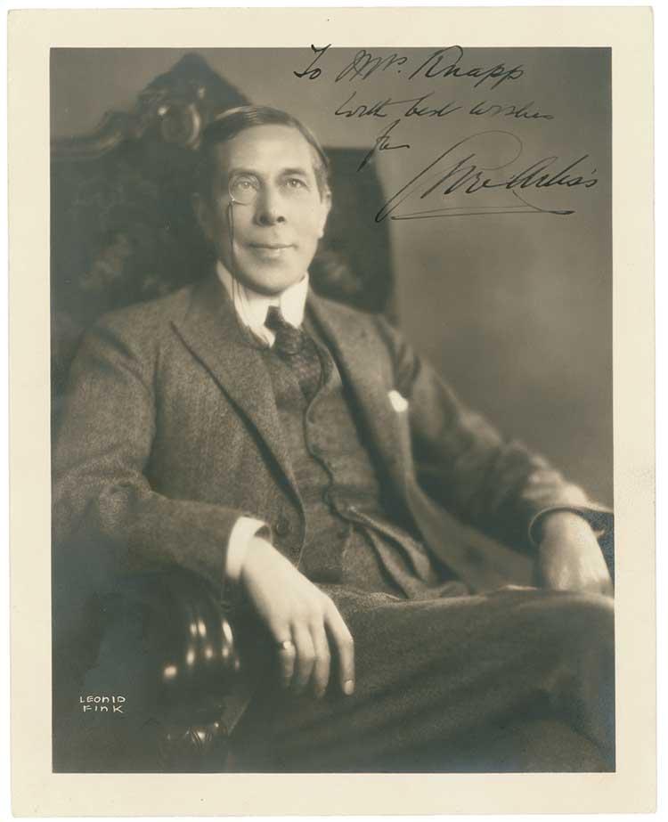 British actor (1868–1946) who won the 1930 Academy Award as Best Actor for the title role in Disraeli. Vintage matte-finish 8 x 10 photo of Arliss sitting in an ornate chair, signed and inscribed in fountain pen “To Ms. Knapp with best wishes from George Arliss.” In fine condition, with some scattered light silvering to darker areas. Pre-certified PSA/DNA and RRAuction COA.