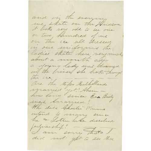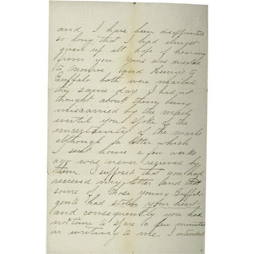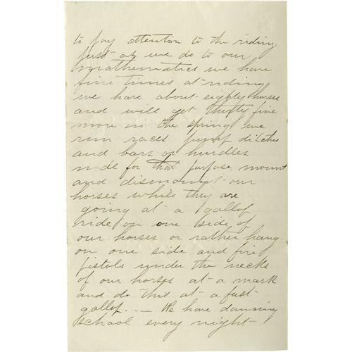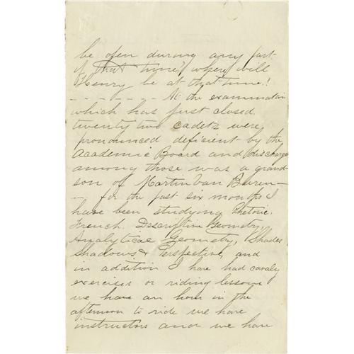 <B> George Armstrong Custer: A Remarkable 8-page Autographed Letter Signed, Written as a 20 Year Old West Point Cadet to his Girlfriend Minnie</B></I> Measuring 5" x 8", written in clear, sharp, black ink, from "<I> West Point, Ny./Jan. 19th /59.</B></I>" Addressed to "<I> My dear Minnie, Earlier letters indicate that this relationship by far was, at the best, uneven</B></I>". In an earlier November, 1858 letter, in which Custer had promised to "<I> to do better in the future</B></I>," she had added in a margin note, "<I> he has broken his promises before</B></I>". Apparently Custer had not heard from her in awhile when he wrote this January letter, because his last letter had taken a roundabout route through the mails. he "<I> soposed that you received my letter, and that some of those young Buffalo gents had stolen your heart, and consequently you had not had time to spare a few minutes in writing to me</B></I>". But now he realizes she had not received his last letter, Custer writes with playful sarcasm, "<I> I think you must have a great opinion of me to think that I would begin to ask you to correspond with me and then drop it without any reason whatsoever. Now although you said that you inferred that I wished our correspondence to cease yet I believe you were not in earnest when you said it and when I visit the City of Flowers (Buffalo) next summer I ask you to pay damages (when I come I shall tell you in what form they shall be paid) for slander. Are you not frightened!...</B></I>" Rather risque banter for those Victorian times. <BR><BR> He goes on to discuss life at West Point with enactive detail: "<I> At examination which has just closed twenty two cadets were pronounced deficient by the academic board and discharged. Among those was a grandson of Martin Van Buren </B></I>". Apparently Custer, always a marginal student at best, survived the cut. <BR><BR> He continues: "<I> For the past six months I have been studying Rhetoric, French, Descriptive Geometry, Analytical Geometry, Shades Shadows and Perspective (Art?), and in addition have had a cavalry exercise or riding lessons. We have an hour in the afternoon to ride we have instructors and we have to pay attention to the riding just as we do our mathematics. We have fine times at riding...in the spring we run races, jump ditches and bars or hurdles... mount and dismount our horses while they are going at a gallop ride of our horses or rather hang on one side and fire under the necks of our horses at a mark and do this at a full gallop</B></I>", <BR><BR> "<I> We have dancing school every night and in the evening we skate on the Hudson,it looks very odd to see one or two hundred of us on the ice in our uniforms...</B></I>" <BR><BR> After more conversation and chatter, he closes, "<I> Ever your friend G.A. Custer,</B></I>" and adds a postscript: "<I> Excuse this envelope as it is the only kind we are allowed to get. Armstrong</B></I>" <BR><BR> Simply a marvelous letter, both for what it shows about Custers character and personality and for its intimate view of the life of a cadet at West Point in the days just before the Civil War. Custer's classmates would soon line up as enemies of one another across savage battlefields, and many would not survive. But in these last idyllic days the young officer's thoughts were still on riding, skating, dancing, and winning the heart of a pretty girl. <BR><BR> Basically Very fine condition but for original fold lines and minor rust staining from a paper clip. Please see our web site for complete images on each page. Accompanied by LOA from PSA/DNA