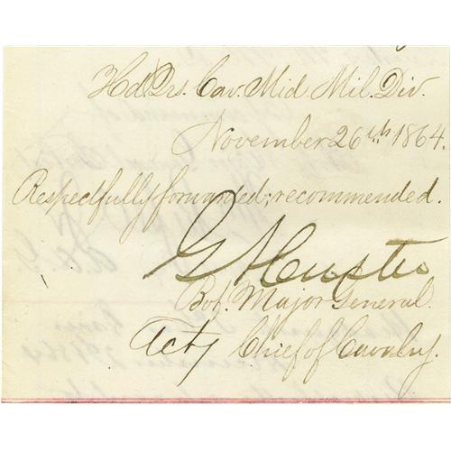 <B>U.S. General George Armstrong Custer Partial Document Signed</B></I> "<I>G A Custer</B></I>". A 3.25" x 2.5" sheet excised from a larger manuscript document, Headquarters Cavalry Middle Military Division, November 26, 1864. This was signed by Custer as brevet major general, acting chief of cavalry, a few weeks after Custer and Sheridan's successful Valley Campaigns, possibly at Petersburg where they spent the winter. Very fine condition with a particularly bold signature.<BR><BR><b>Shipping:</b> Miscellaneous Collectibles, Smal (<a target="_blank" href="http://www.heritageauctions.com/common/shipping.php">view shipping information</a>)