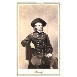 May 1865 portrait, K-70 in Katz, "Custer in Photographs.” Identified there as by John Goldin & Co. This is by Brady, with the name on the mount, recto, and the Brady National Portrait Gallery logo on verso. Note that the Goldin image illustrated in Katz goes a little lower, showing where the backdrop meets the floor. Two tiny pinholes on the top of the mount create a slight disturbance between them. [3]