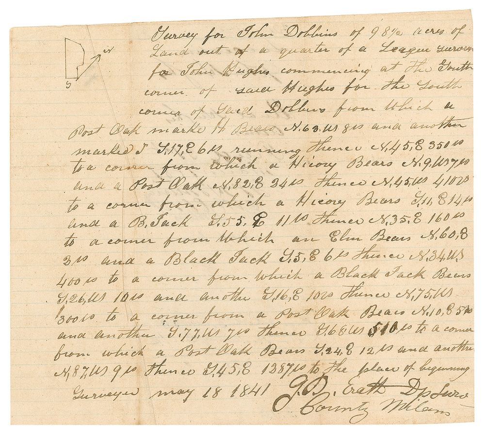 Soldier and legislator (1813–1891), who was an early surveyor and a soldier at the Battle of San Jacinto. Manuscript DS, signed “G. B. Erath D. Surv, County Milam,” one lightly-lined page, 8 x 7, May 18, 1841. Land survey for 98 1/2 acres of land belonging to John Dobbins, signed at the conclusion by Erath, and also featuring a small sketch of the land in the upper left corner. In very good condition, with two vertical folds, a uniform shade of toning, several creases, including one through small portion of sketch, and mild show-through from docketing on reverse. The Robert Davis Collection.