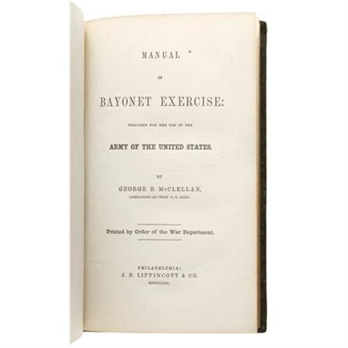 <B>George B. McClellan, <I>Manual of Bayonet Exercise Prepared for the Army of the United States,</B></I></B></I> (Philadelphia: J. B. Lippincott & Co., 1862), 118 pages, with 24 illustrations, 12mo (5 x 7.5), spine lightly frayed and shelf wear, else very good. <BR><BR><b>Shipping:</b> Books & Catalogs (<a target="_blank" href="http://www.heritageauctions.com/common/shipping.php">view shipping information</a>)