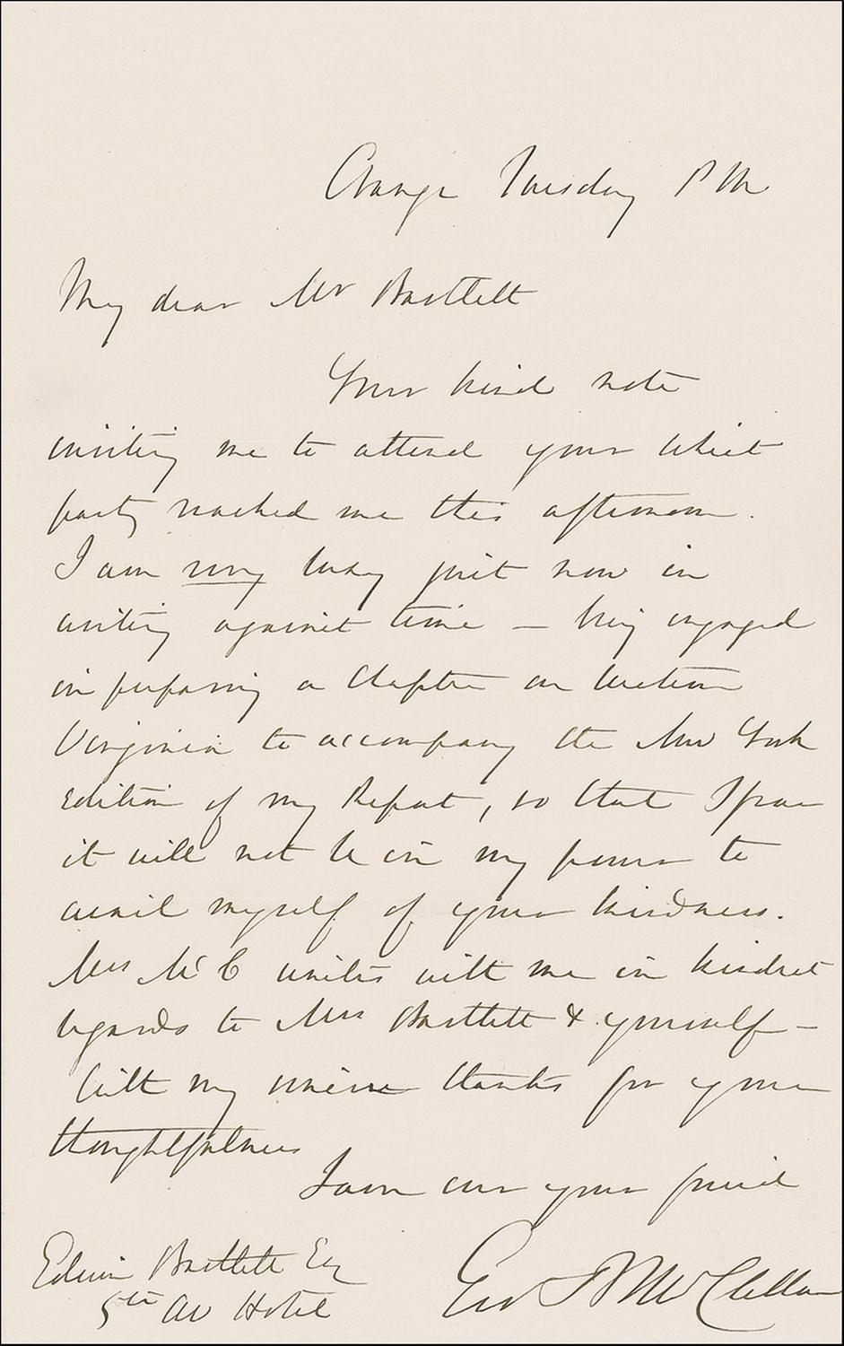 Union general (1826–1885) removed from command by Lincoln for his failure to exert pressure on Lee’s army during the crucial Peninsula Campaign. He ran unsuccessfully for the presidency in 1864 and later served as Governor of New Jersey. War-dated ALS signed “Geo B. McClellan,” one page, 5.25 x 8.25, no date [but penned in January 1864 based on its content]. Letter to Edwin Bartlett. In full: “Your kind note inviting me to attend your Whist party reached me this afternoon. I am very busy just now in writing against time–being engaged in preparing a Chapter on Western Virginia to accompany the New York Edition of my Report, so that I fear it will not be in my power to avail myself of your kindness. Mrs. McC unites with me in kindest regards to Mrs Bartlett & yourself. With my sincere thanks for your thoughtfulness.” In fine condition.