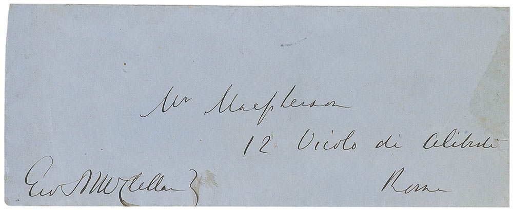 Hand-addressed address panel, 5.5 x 2.25, addressed by McClellan to “Mr. Maepherses, 12 Vicolo di Alibriti, Rome,” and signed in the lower left, “Geo. B. McClellan.” Some light show-though and toning from adhesive on reverse, and some scattered light creases, otherwise fine condition.