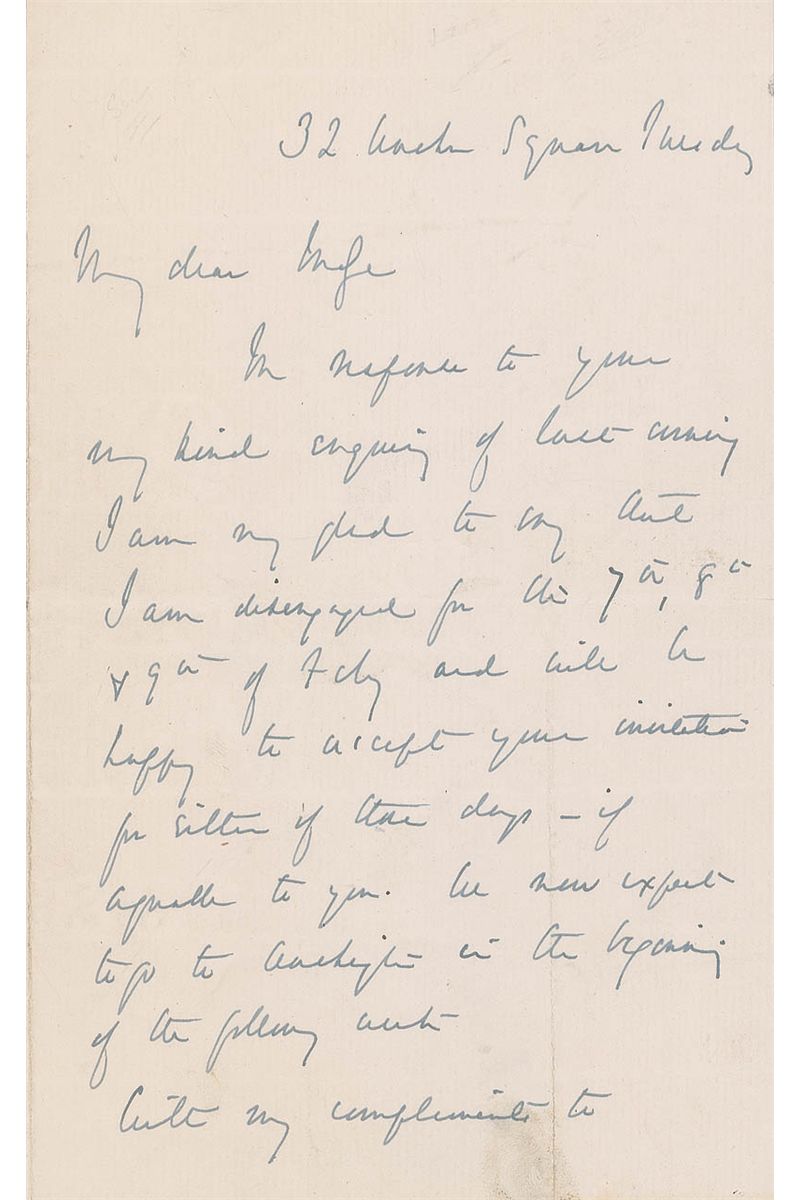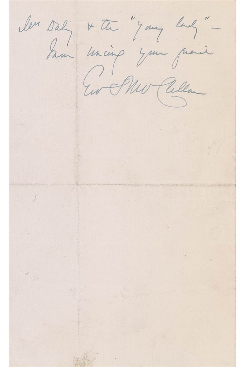 ALS signed “Geo. B. McClellan,” two pages on two adjoining sheets, 5 x 8, no date. Letter to Judge Daly. In full: “In reference to your very kind enquiry of last evening I am very glad to say that I am disengaged for the 7th, 8th & 9th of Feby and will be happy to accept your invitation for either of these days–if agreeable to you. We now expect to go to Washington in the beginning of the following week.” In fine condition, with horizontal and vertical mailing fold and a bit of scattered light soiling.