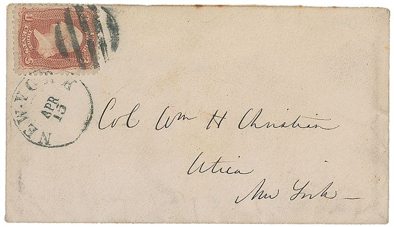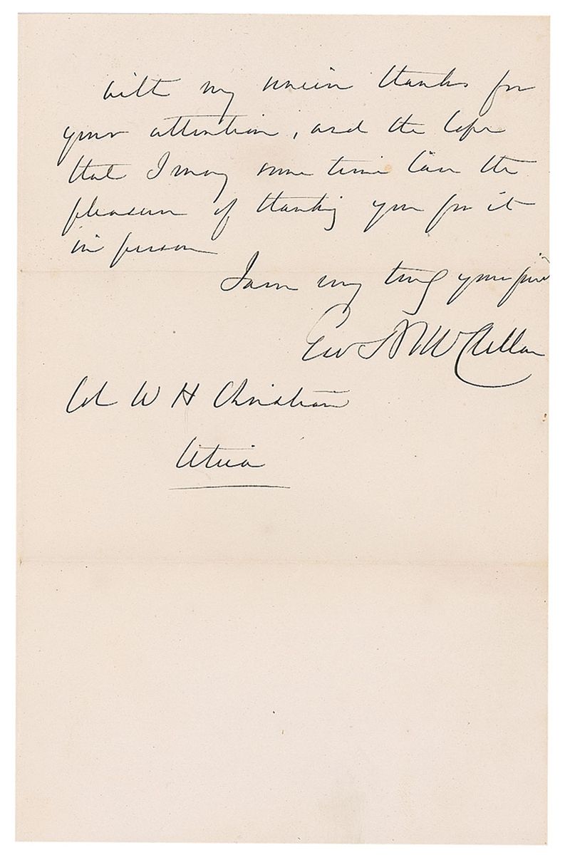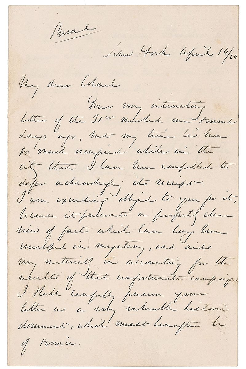 War-dated ALS signed “Geo S. McClellan,” two pages on two adjoining sheets, 4.5 x 7, April 13, 1864. Letter to Colonel William Christian. In part: “Your very interesting letter of the 31st reached me some days ago, but my time has been so much occupied while in the city that I have been compelled to defer acknowledging its receipt. I am exceedingly obliged to you for it, because it presents a perfectly clear view of facts which have long been enveloped in mystery, and aids me materially in accounting for the results of that unfortunate campaign. I shall carefully peruse your letter as a very valuable historic document, which must hereafter be of service.” In fine condition. Accompanied by the original mailing envelope. Christian fought at Bull Run and Antietam, and was later committed to the New York State Lunatic Asylum, the results of sun stroke and battle stress.