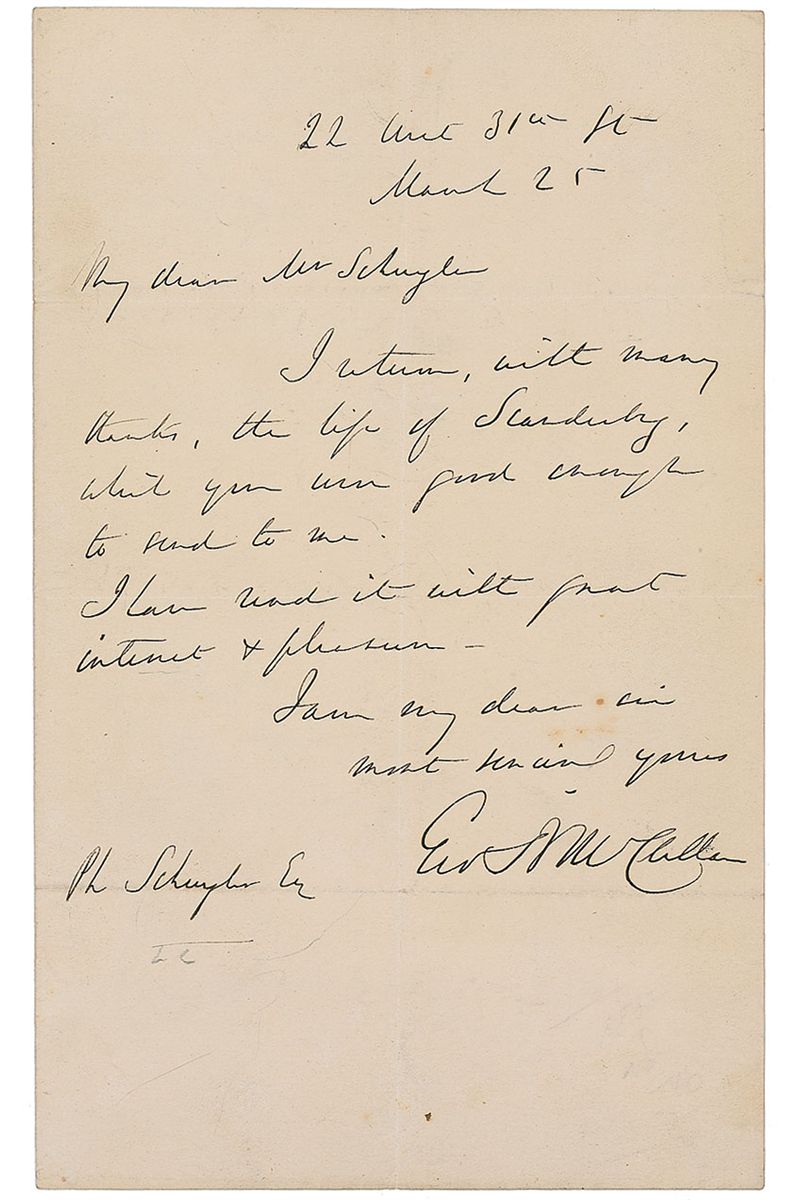 Union general (1826–1885) hailed at the beginning of the Civil War as the ‘Young Napoleon,’ who was defeated for the presidency in 1864 by Abraham Lincoln. ALS signed “Geo. B. McClellan,” one page, 4.75 x 8, March 25. Letter of thanks to [Union Brigadier General Philip] Schuyler. In full: “I return, with many thanks, the life of Scarduby, that you were good enough to send to me. I have read it with great interest & pleasure.” In fine condition, with intersecting folds, and a few spots of mild toning. Accompanied by mailing envelope, bearing an image of McClellan.