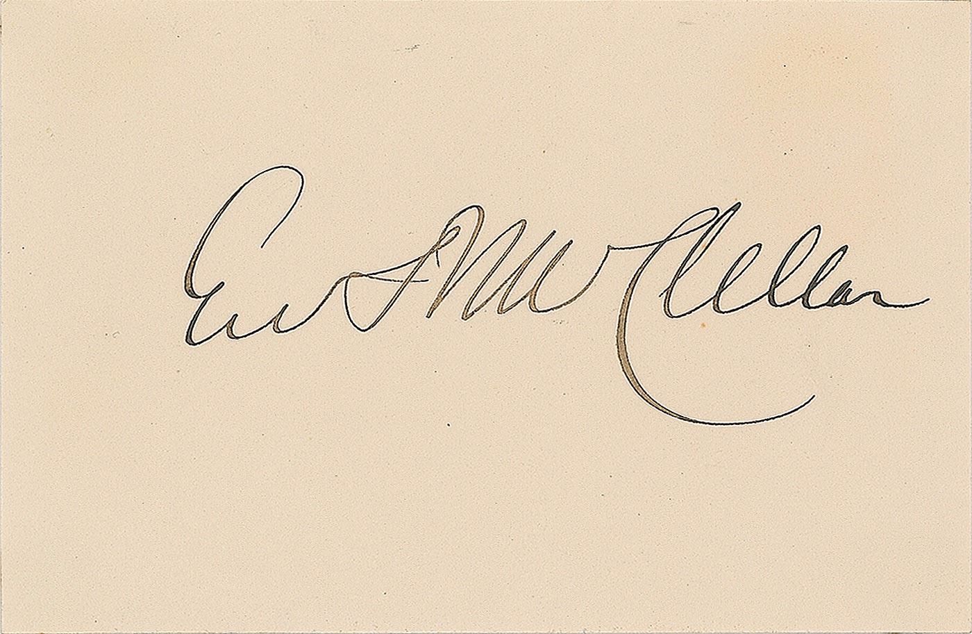 Desirable ink signature, "Geo. B. McClellan,” on an off-white 3.25 x 2.25 card. In fine condition.