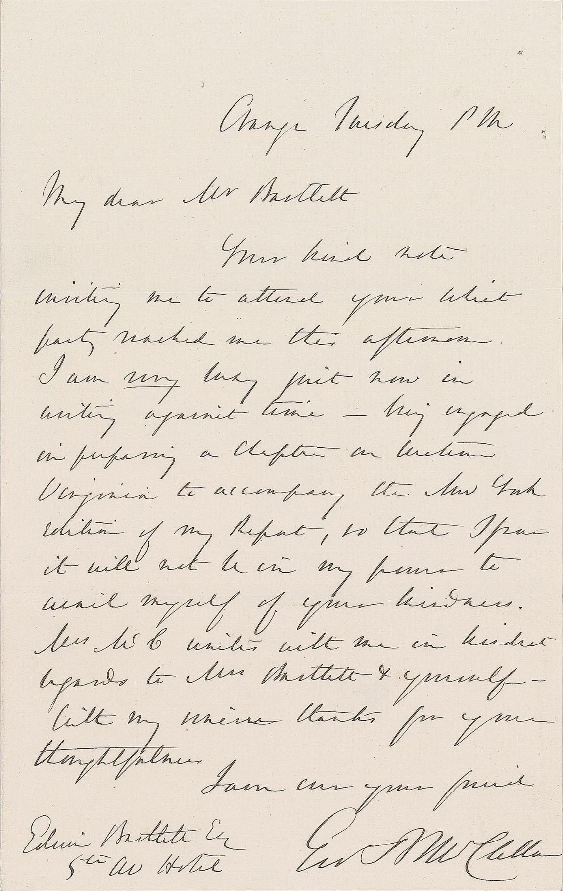 Civil War–era ALS signed “Geo. B. McClellan,” one page, 5.25 x 8.25, no date but circa January 1864. Letter to Edwin Bartlett, in part: “Your kind note inviting me to attend your Whist party reached me this afternoon. I am very busy just now in writing against time—being engaged in preparing a Chapter on Western Virginia to accompany the New York Edition of my Report, so that I fear it will not be in my power to avail myself of your kindness. Mrs. McC unites with me in kindest regards to Mrs. Bartlett & yourself.” In fine condition.