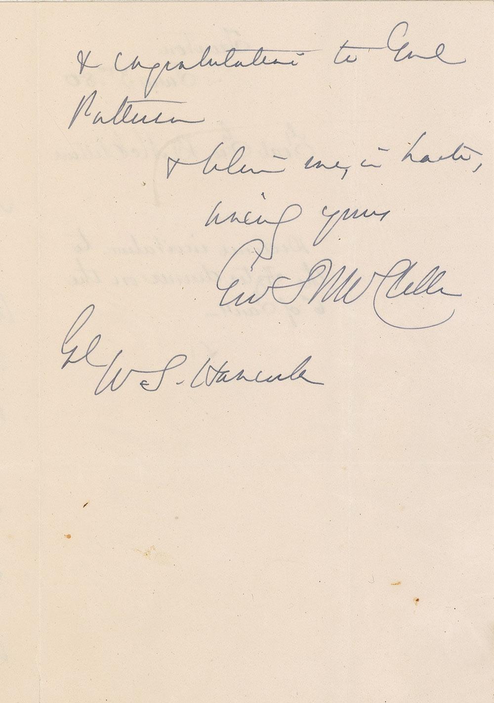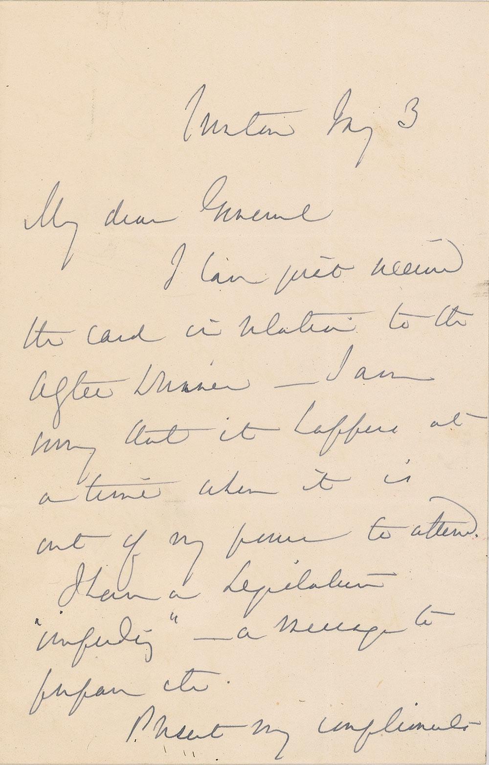 Union general (1826–1885) removed from command by Lincoln for his failure to exert pressure on Lee’s army during the crucial Peninsula Campaign. He ran unsuccessfully for the presidency in 1864 and later served as Governor of New Jersey. ALS signed “Geo. B. McClellan,” two pages on two adjoining sheets, 4.5 x 7, January 3, 1880. Letter to General Winfield Scott Hancock declining an invitation to the Aztec Club dinner. In part: “I have just received the card in relation to the Aztec Dinner—I am sorry that it happens at a time when it is out of my power to attend. I have a Legislation ‘pending.’” Letter is encased in protective Mylar. Intersecting folds, light toning, and docketing to reverse of second page, otherwise fine condition. Pre-certified PSA/DNA and RRAuction COA.
