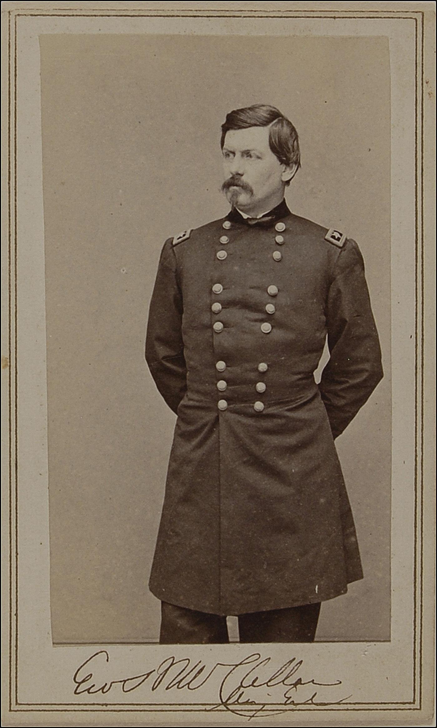 Scarce original vintage 2.5 x 4 carte-de-visite three-quarter length portrait of McClellan in uniform, his hands folded behind his back, signed in the lower border in black ink, “Geo. B McClellan, Maj. Gen.” Matted and framed to an overall size of 7.75 x 9.5. In fine condition, with a bit of trivial foxing to borders, and a light impression affecting the tops of a couple letters in last name of signature. Pre-certified PSA/DNA and RRAuction COA.