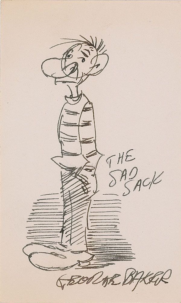Original signed ink sketch of the Sad Sack on an off-white 3 x 5 card. In fine condition.