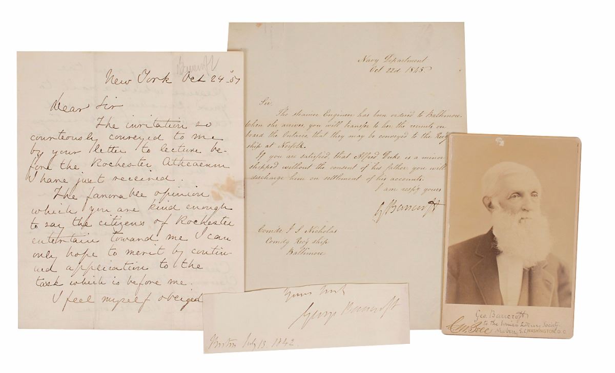 Collection of four items, each signed by Bancroft, including: a cabinet photo signed and inscribed to a South Carolinian literary society; an LS as secretary of the Navy regarding the steamers “Engineer” and “Ontario”; an LS declining an invitation to lecture at the Rochester Athenaeum; and a clipped signature. A spot of surface loss to the top of the cabinet photo and some repaired reparations to letters, otherwise overall fine condition.