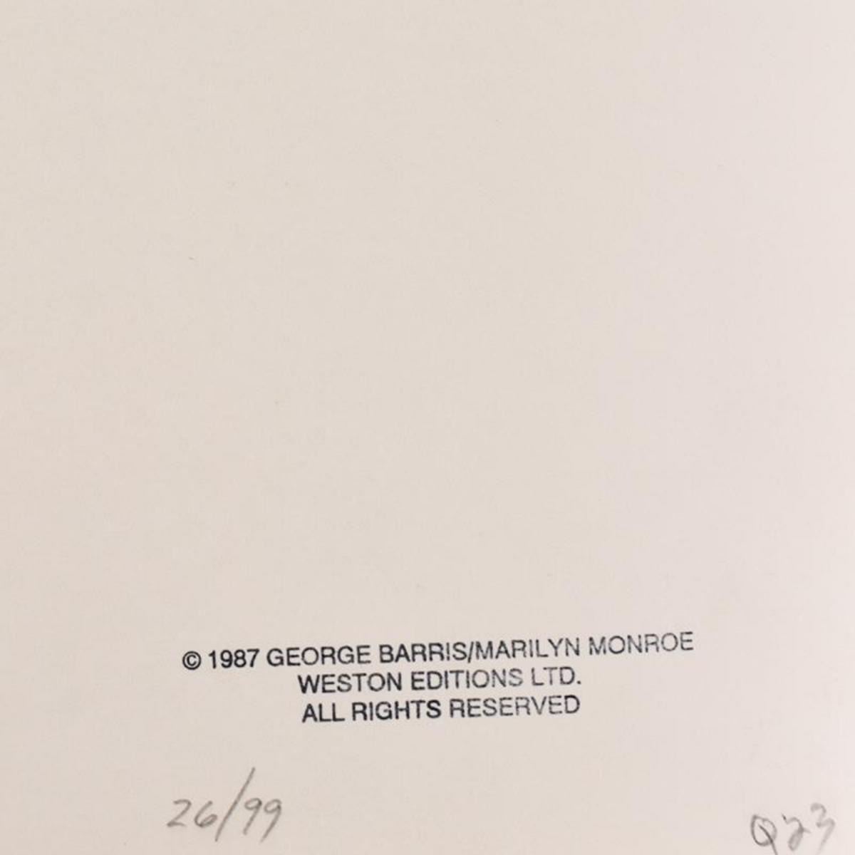 "Marilyn Monroe: The Last Shoot" is a photograph printed from the original negative taken by George Barris (1922-2016). This photo is part of a series entitled "The Last Photos"; they were taken in 1962 just two weeks before Monroe's death and are considered the last photos ever taken of the icon. This piece is numbered inverso 26/99 and hand signed by the photographer. This photo bears the Edward Weston copyright stamp inverso and Includes Letter of Authenticity. Measures approx. 14" x 11" (image). Reference #: 251749