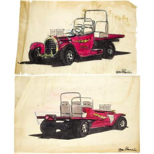 <B>George Barris "Flash" Concept Design Artwork.</B></I> A pair of 16" x 10" ink-and-watercolor design drawings featuring back and front 3/4 views of "Flash," a hot rod version of the <I>Beverly Hillbillies</B></I> truck, as seen in the episode "The Hot-Rod Truck." Both are signed by Barris and are in Fine condition with mild to moderate toning and edge wear, some small tears, mild creasing, and some areas of water damage. <I>From the George Barris Archive.</B></I><BR><BR><b>Shipping:</b> Flat Material, Large (<a target="_blank" href="http://www.heritageauctions.com/common/shipping.php">view shipping information</a>)