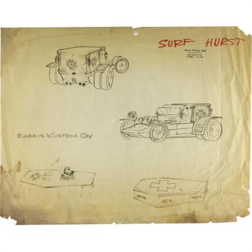 <B>George Barris "Surf Hurst" Design Sketch.</B></I> Four illustrations on 22.5" x 18" drawing paper for a custom car combining surf buggy with a <I>Munsters</B></I>-esque horror theme, from George Barris' personal collection of design sketches. In Fine condition with moderate wear, toning, tearing, and water damage to the edges and corners, affecting only the lower right illustration, with a "Barris Kustom City" stamp in the upper right corner. <I>From the George Barris Archive.</B></I><BR><BR><b>Shipping:</b> Flat Material, Large (<a target="_blank" href="http://www.heritageauctions.com/common/shipping.php">view shipping information</a>)
